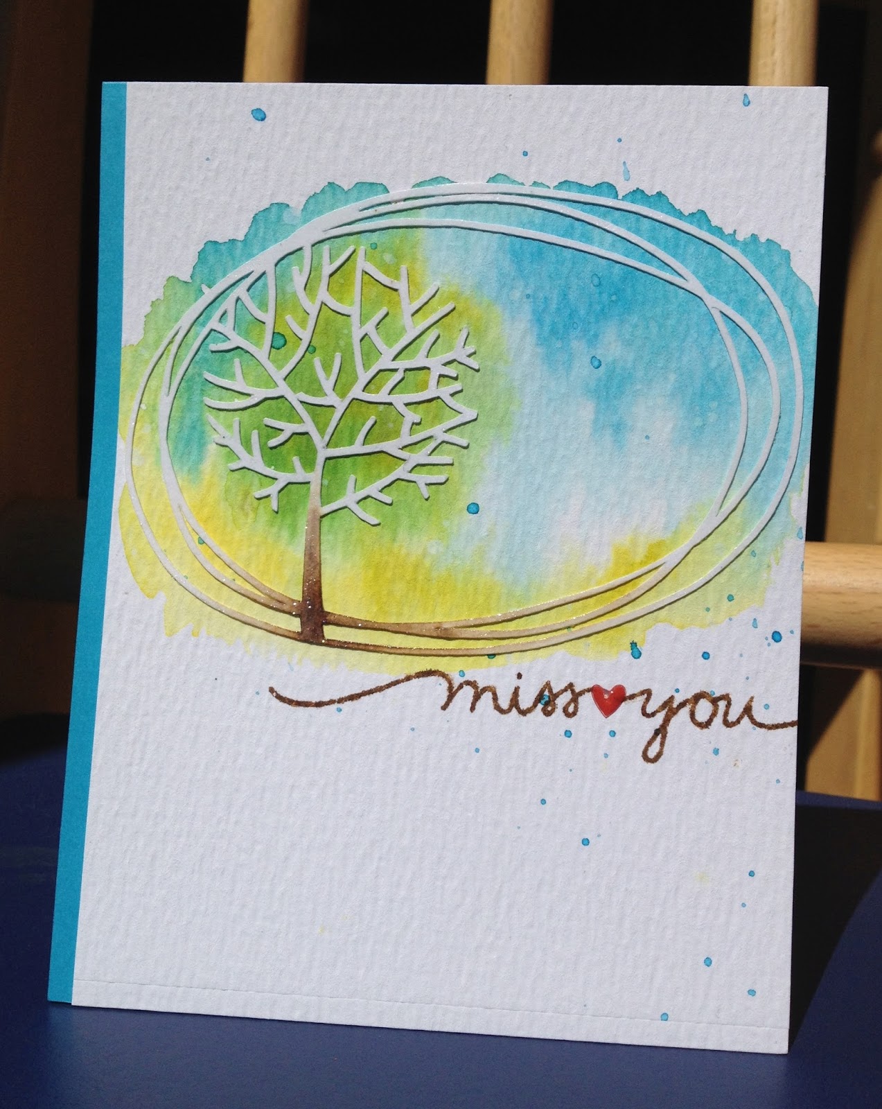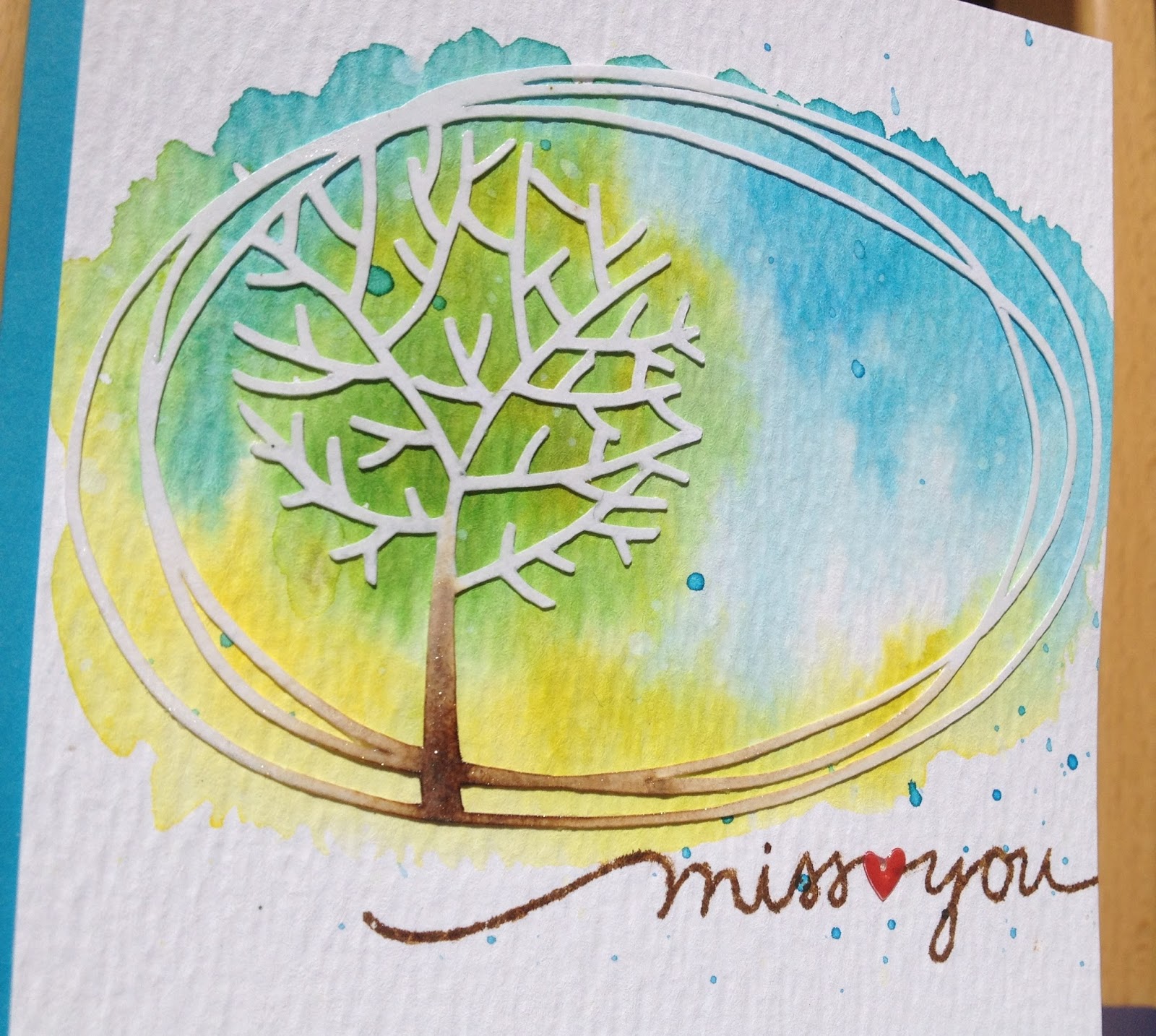 I designed an oval frame with a tree as a svg-cut file and cut it with my Cricut cutting machine. I used ranger watercolor paper as background panel, which I colored with distress ink in various green, blue and yellow color range.