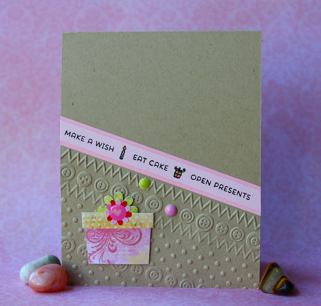 The second card is a birthday card. At first I dry embossed the lower part of the card base slightly tilted using cuttlebug embossing folder for borders. I then adhered a present from Cricut Store which I printed and cut with Cricut, with a foam tape. The sentiment is stamped on a soft pink cardstock with black pigment ink and clear heat embossed. I added a pink layer under the sentiment and adhered it along the edge of the embossed part. I added a litte flower sticker on the present and placed two enamel dots.