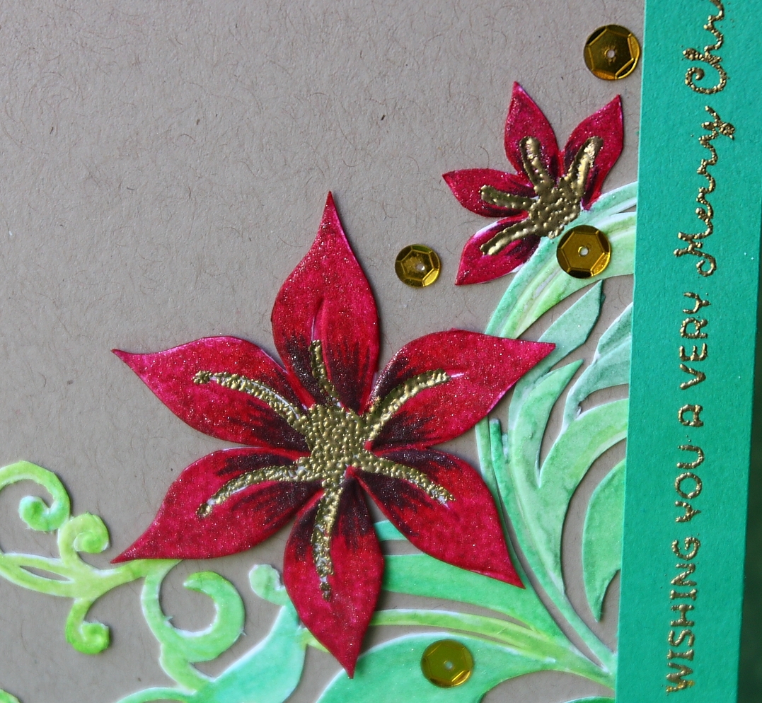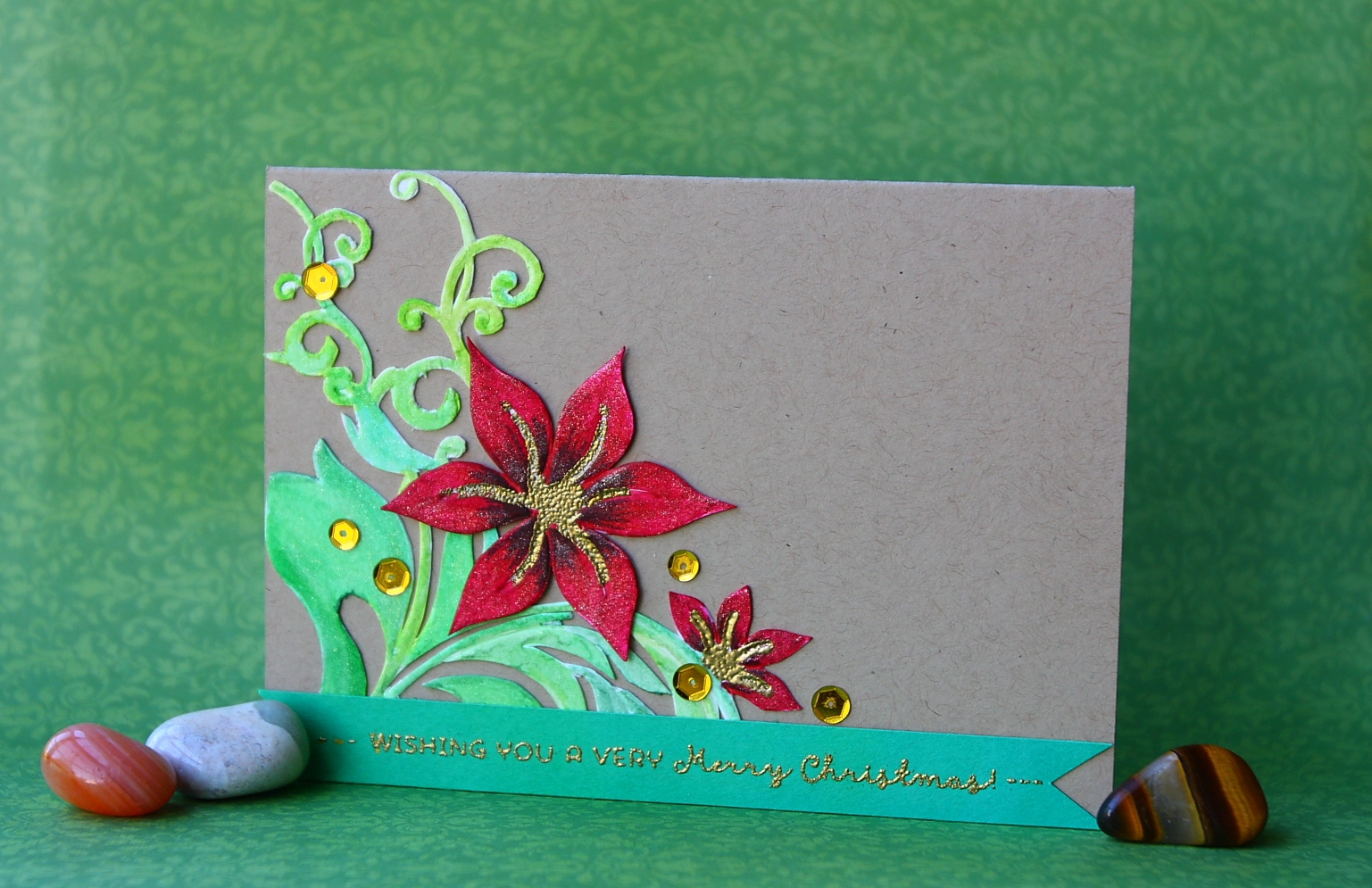 The image of the first card is from CGull embossing folder. I dry embossed a watercolor paper, colored it with Inktense pencils and watercolor brush pens and added some glitter with wink of stella. The center of the flowers were heat embossed with gold embossing powder after I draw it with an embossing pen. I cut the image with craft knife and adhered it on the card base. I hope you can recognize the line of the sketch in my card design. Under the big flower is an extra layer added for some dimension. Because the big red flower reminded me poinsettia, I chose a sentiment for christmas. The sentiment from Technique Tuesday is stamped on a green cardstock and gold heat embossed. Some gold sequins gave the card the final touch. Actually I wanted to make this card vertical but the sentiment didn’t fit at the bottom, so I adhered the sentiment on the right side. But I think still the vertical look is better than horizontal, or not?