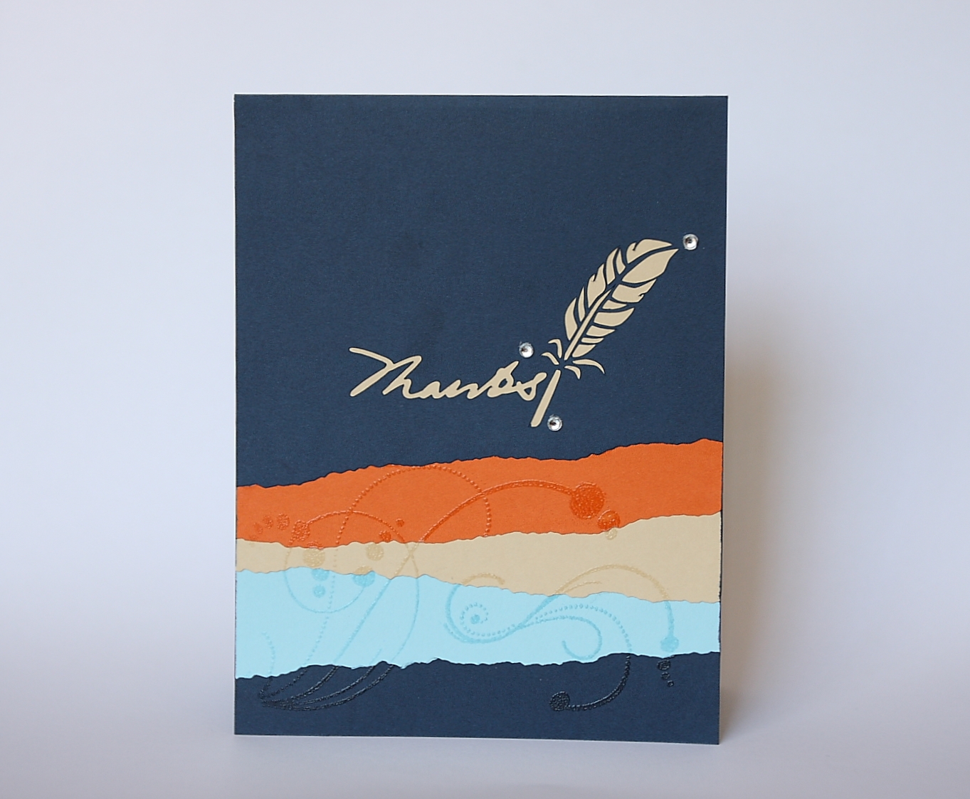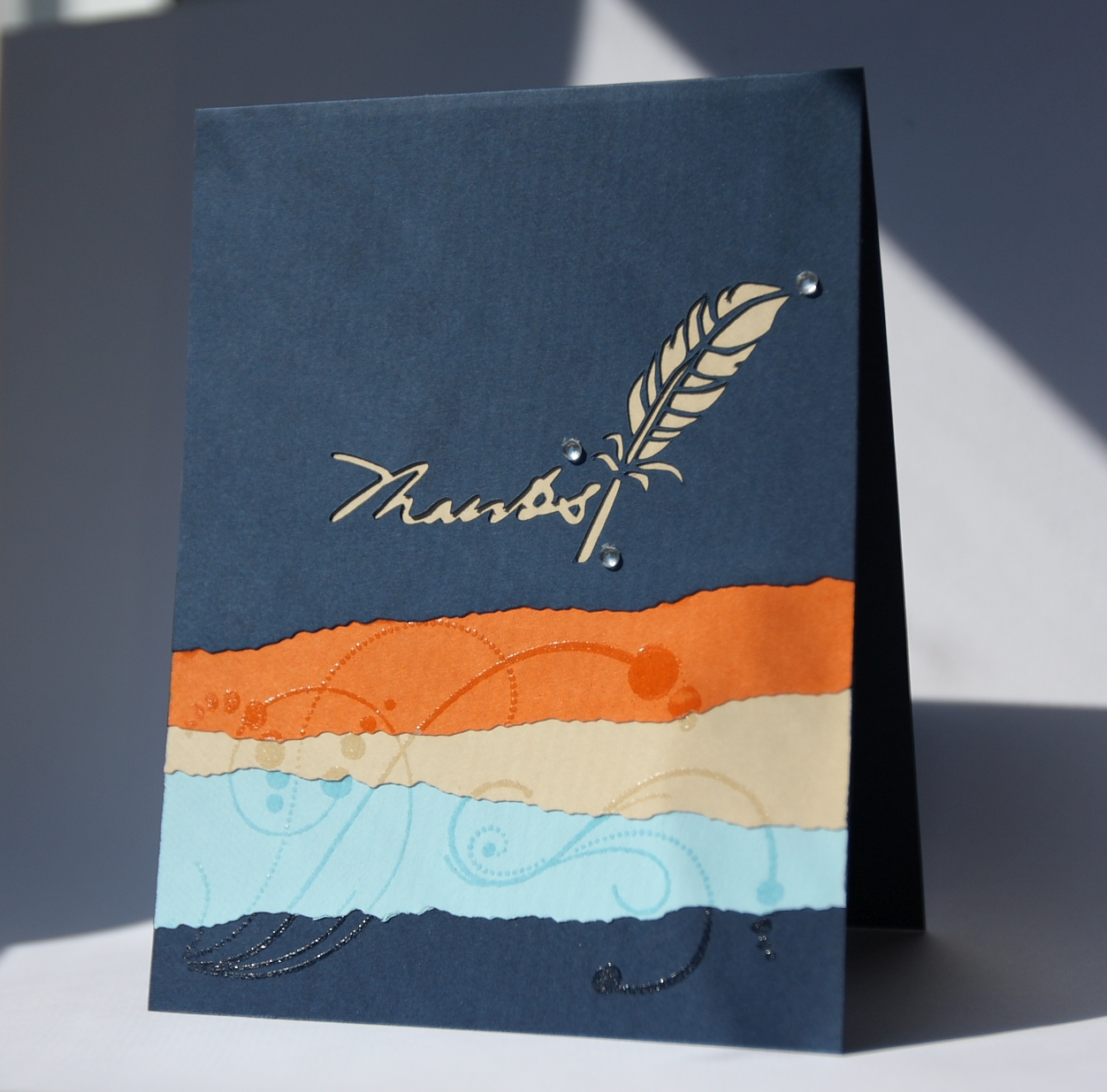 From the Throwdown colours I chose dark blue as my main colour. I made cutting files for the sentiment and a feather. The sentiment is handwritten by my husband :). I cut(Cricut) the sentiment and a feather out of a dark blue cardstock which I used as the card base. I stamped Dot Flourishes stamp from Inkadinkado on an orange, beige, light blue and dark blue cardstock using embossing ink and clear heat embossed them. I then cut them with Distressed Edges die from Spellbinders while aligning the stamped images. I mounted the die cut stripes on the dark blue card base as shown in the picture.
