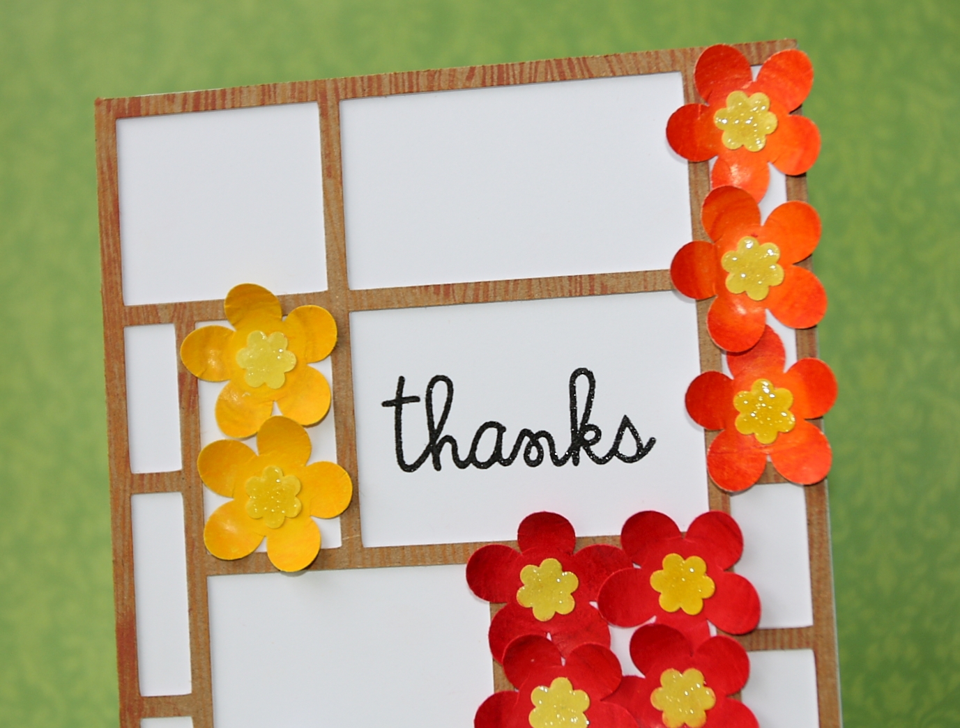 At first I made a cutting file using the sketch as it is for the look of an wooden lattice, cut it with Cricut three times in white cardstock and cut once in kraft cardstock. I stamped woodgrain pattern on the kraft lattice in brown. The sentiment is stamped on the card base in black and clear heat embossed. I adhered the lattice in layer for some dimension on the card base. I then punched flowers out of a cardstock which I colored using colored pencils, curled up the petals and glued them on the card as shown in the picture. I chose orange instead of green from the sketch at HLS. I added glossy accents on the center of the flowers for some shine :).