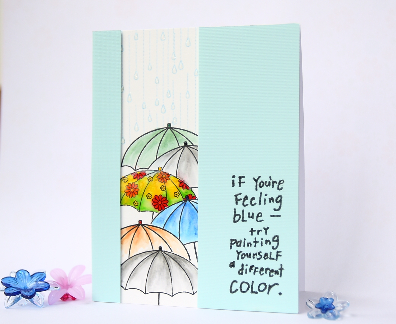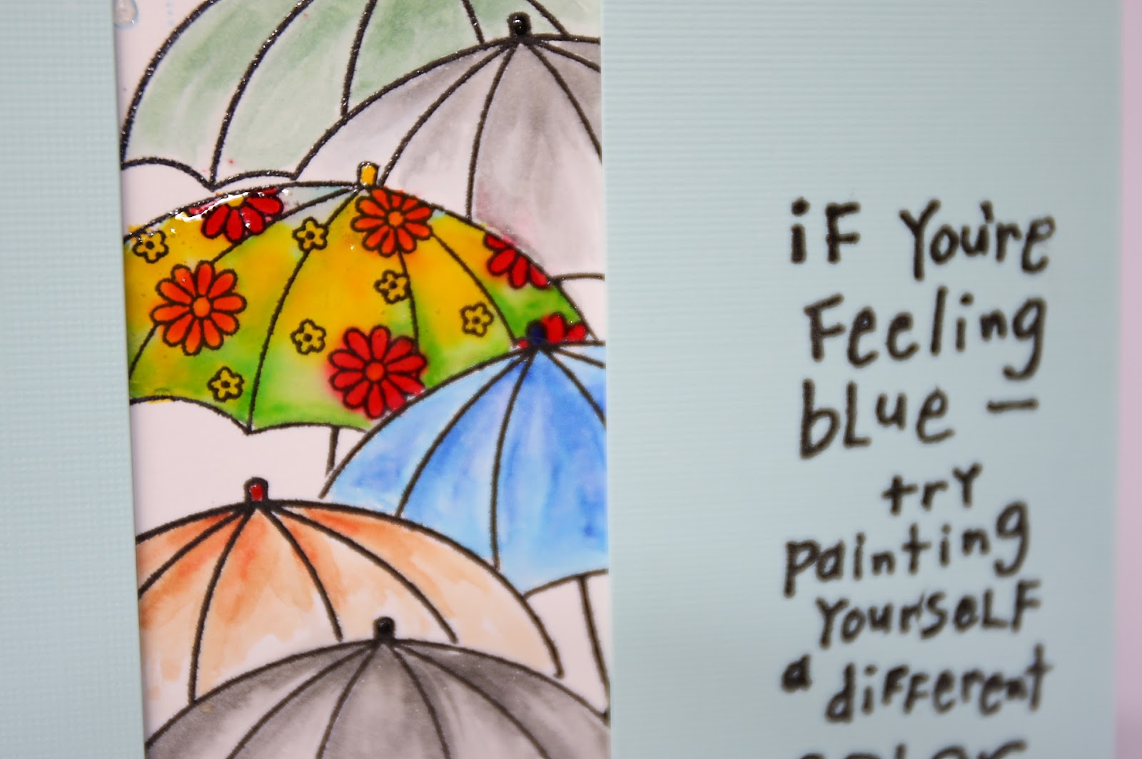 To start off I stamped umbrellas from April Showers stamp set by Penny Black using masking technique, so that it looks like a street scene on a rainy day. The umbrellas was stamped in black and clear heat embossed. I then colored the umbrellas using watercolor brush pens, one with bright coloured flowers and the others in darker colours. I added Glossy accents on the bright umbrella.The raindrops were stamped in light blue and got glossy accents. The sentiment from Inkadinkado was stamped on a light blue panel. I mounted the light blut panel popped up on the card.