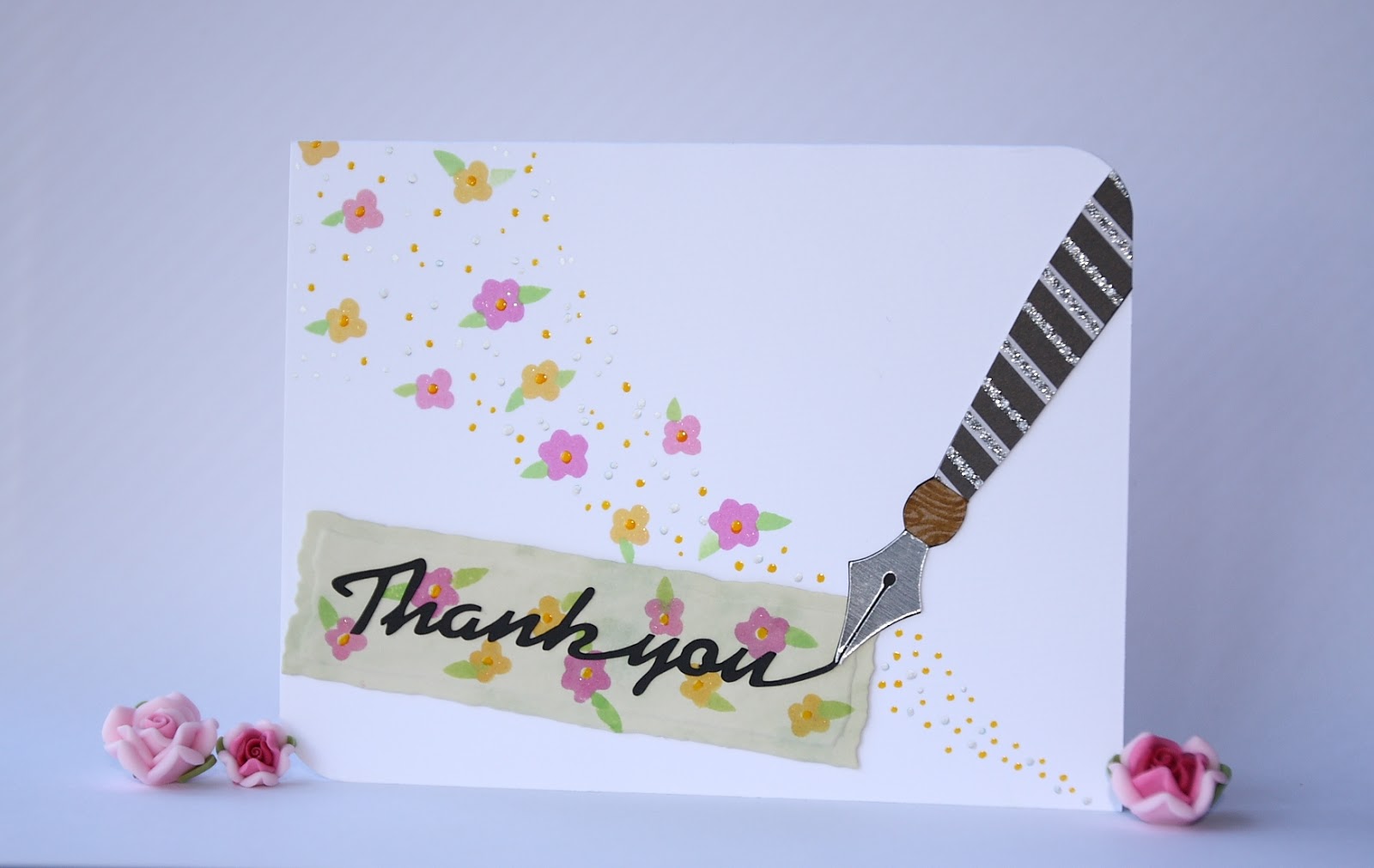 I stamped little flowers and leaves using two stamp sets (Botanicals2 and Blossoming buds) from Paper Smooches on the die cut panel and the card base and added some dots using glaze pens. I assembled all the elements as shown in the picture and rounded two diagonal corners to finish off the card. What I tried to show is that the written message flies towards the recipient like fragrance or pixie dust 😉