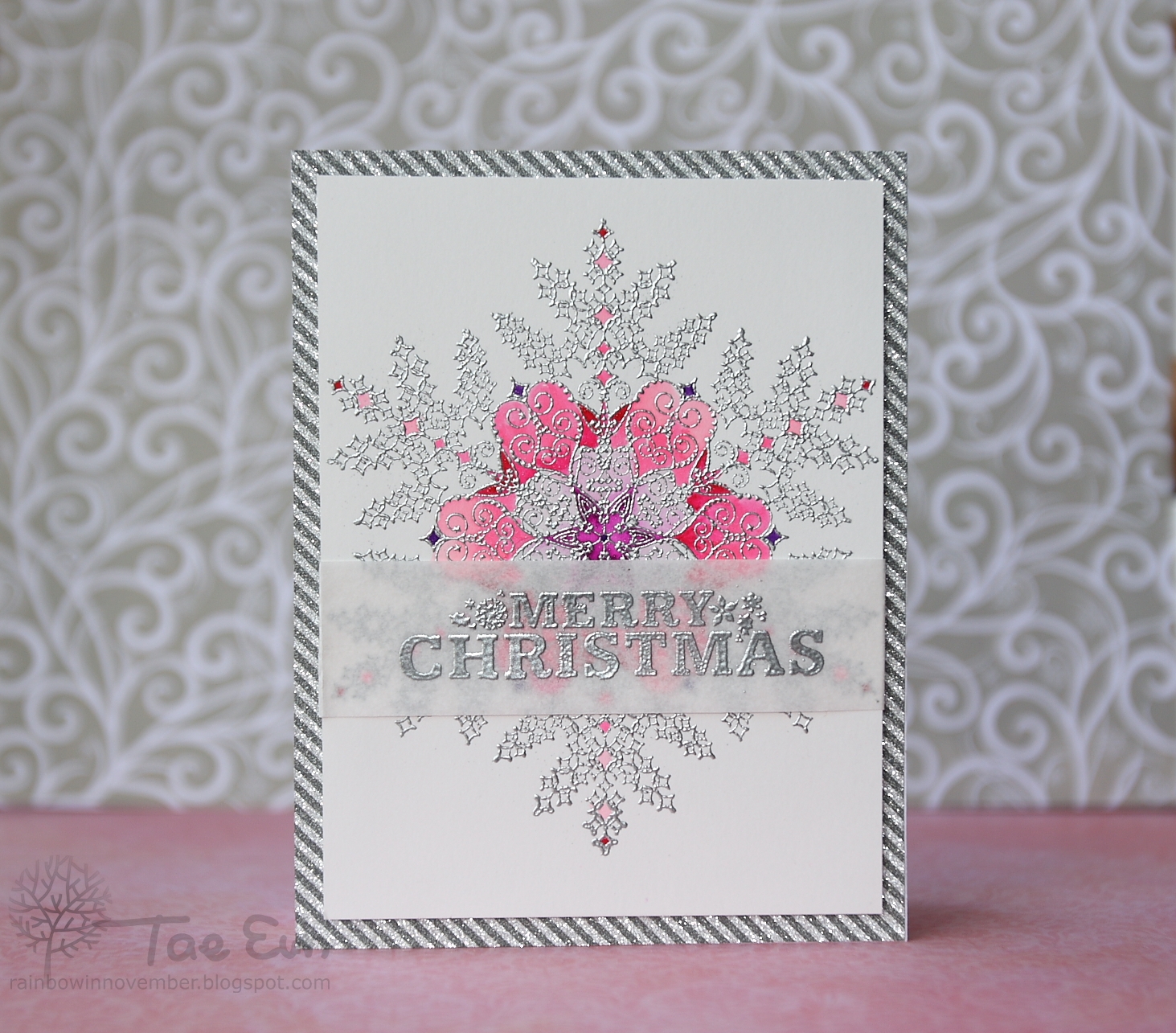 I started off by stamping the snowflake using embossing ink on a watercolor paper and then heat embossed it in silver. I then colored the snowflake using Distress inks in pink and purple shade. The fussy cut snowflake was glued slightly offset on the card base on which I placed a silver shimmer CS which was cut using Distressed edges die from Spellbinders. I die cut the sentiment from Hero Arts from a foiled silver CS. It was stacked and glued on the card.
