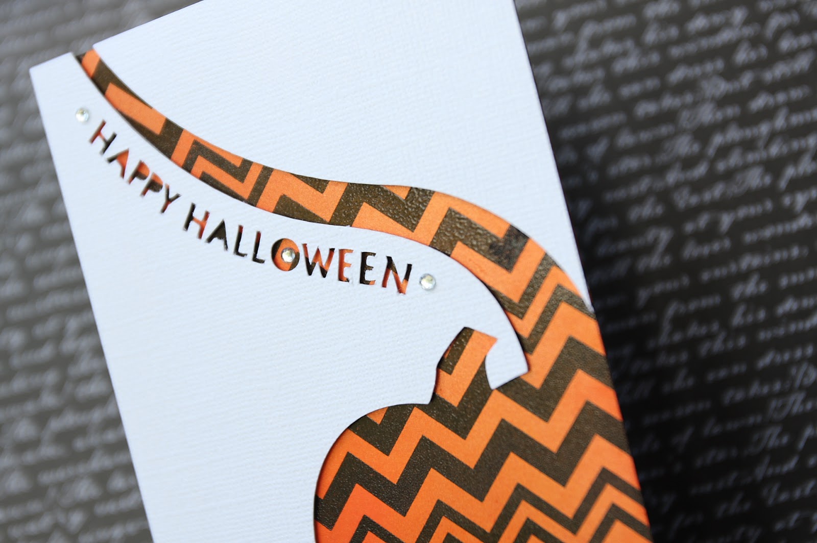 For this card I used the same cutting file for pumkin but made an additional layer with slightly smaller pumpkin, which I cut out in black for outline. I arranged the pumkin offset and welded the sentiment (font: Powerhouse Era). The pumpkin was coloured in orange using the same technique like the first card. Before I applied the Perpect Pearls biscotti, I created black diamond pattern with a stencil I made for this pumpkin.