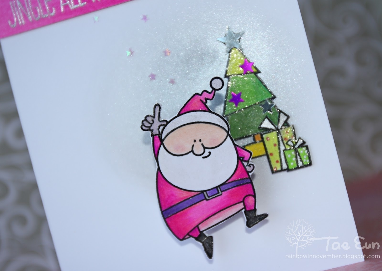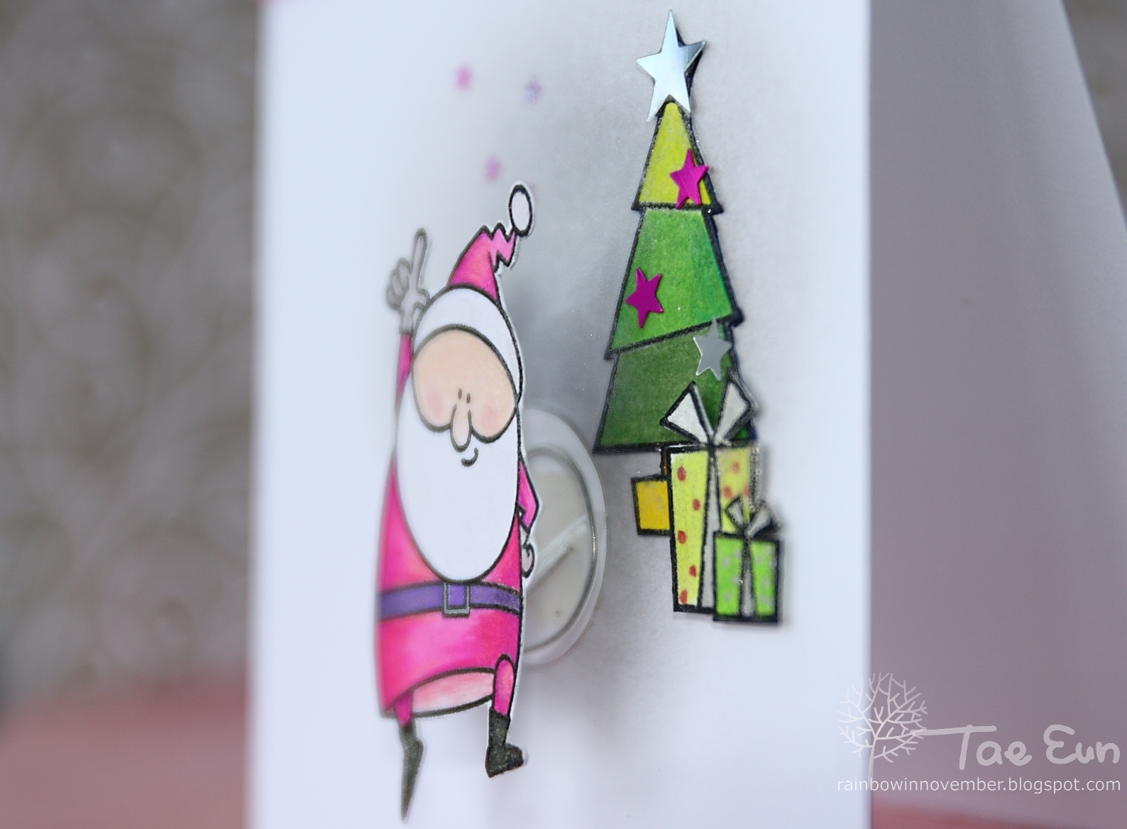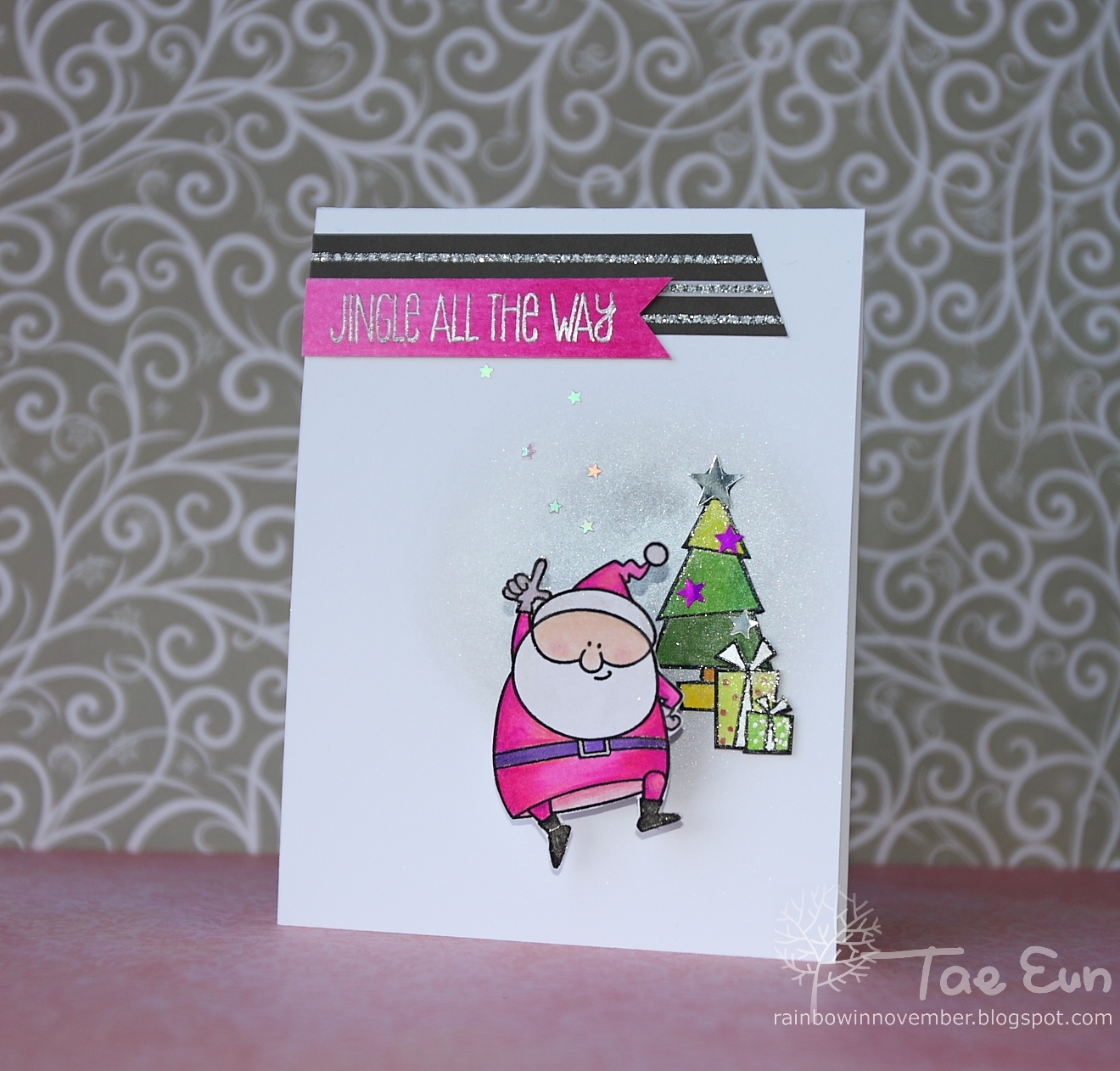 I stamped santa, christmas tree and the presents on a white CS using Memento black ink. After I colored the images with Prismacolor colored pencils, I stamped the images once again with black pigment ink and clear heat embossed. A load of wink of stella was added and some silver accents using silver gel pen.