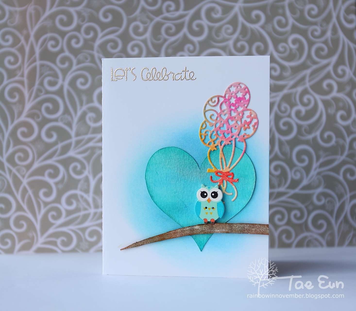 I then colored water color CS using Distress inks in blue+teal for the heart panel and in pink+yellow for the balloon die cut. Since the owl button is about 2mm thick I made a branch also with the same thickness for the owl to sit on. The heart was cut with my Cricut. The Balloon Bouquet die is from Cottage Cutz.