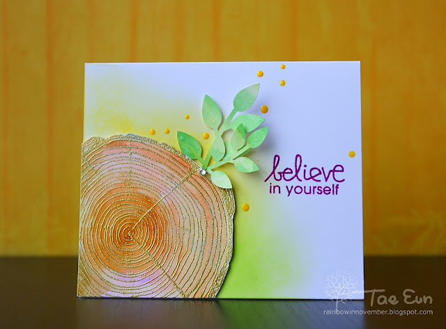 To start off I stamped the tree ring image using embossing ink on a water color paper. After heat embossed it in gold I colored the stump and fussy cut it. The sprout were made using free cutting file from Birdscards. I colored an scrap water color paper in green and cut the branches with my Cricut.
