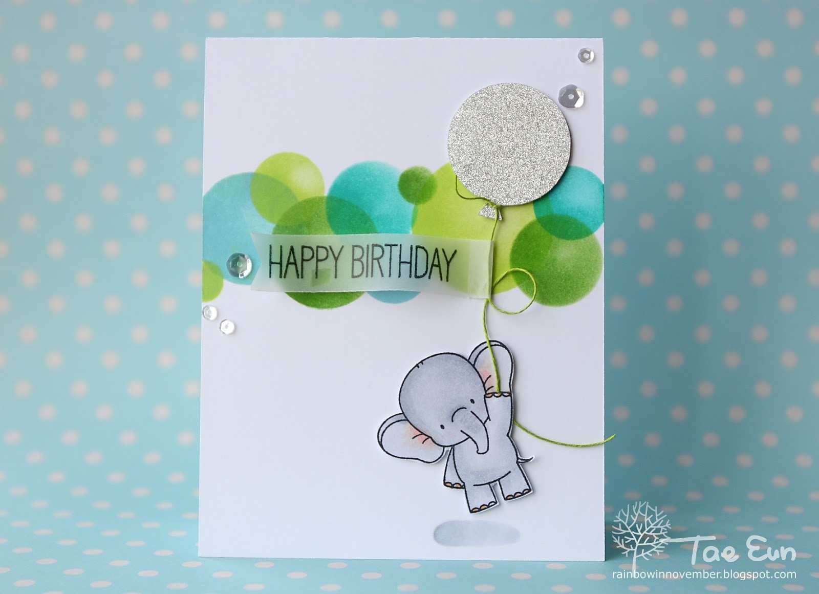 To start off I cut circles in various size from a scrap paper using my Cricut. I used it as a stencil to sponge some Distress inks (Mowed lawn, Twisted citron, Tumbled glass, Peacock feather) on the card base so that it can show the horizontal panel in the sketch. The elephant was stamped in black and colored with copics which I’ve got as a christmas gift :)!!! It was my first try with this marker. After I fussy cut the elephant, I cut a balloon from a silver glitter paper, tied some soft green twine on the balloon and gave it to the elephant. I mounted the elephant and the balloon using some foam tape.