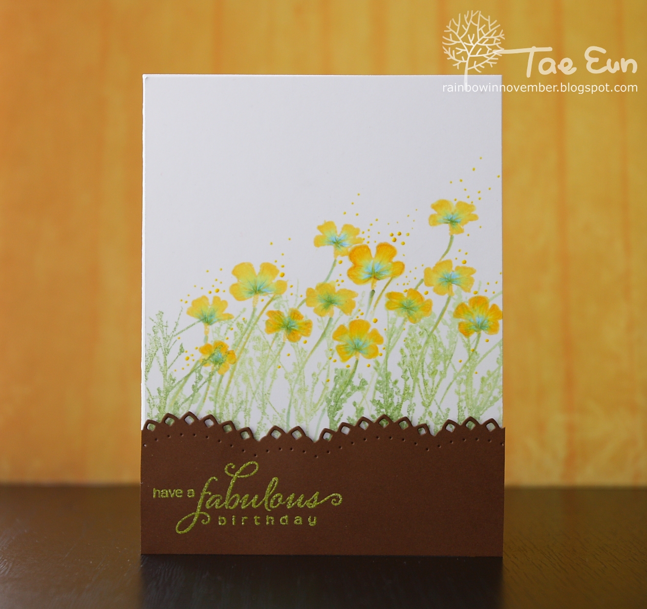 The greenery and flower images are from Penny Black. I stamped the greenery first using green memento inks, partly with the second generation. I then stamped the flowers in yellow and colored them using copic markers and colored pencils. I added some details on the greenery too.
