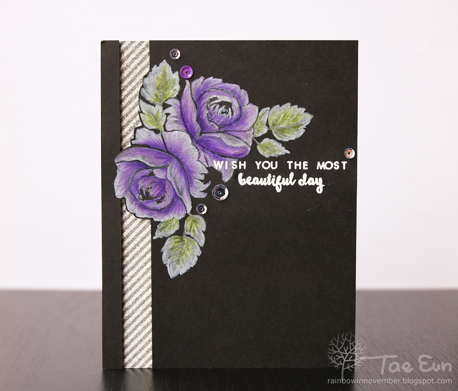 I took a black CS and stamped the second layer of the rose and branch from Vintage Flowers stamp set by Altenew using white pigment ink. I then colored the images with my Prismacolor pencils. I chose purple for the roses like the background color of Marika’s card. I cut a vertical strip out from the left part to mimic Marika’s card. The sentiment from Altenew was stamped and white heat embossed. I added a glitter pattern paper on the card base and mounted the black panel using 3D foam.