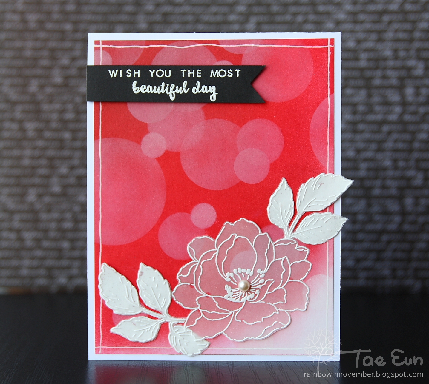 I started by blending Fired brick, Barn door and Festive berries DI on a white CS making a ombre toward a white corner on which I sponged white pigment ink. I then made a bokeh background using circle stencils and white pigment ink. I trimmed the panel, drew white frame and mounted it on a white card base.