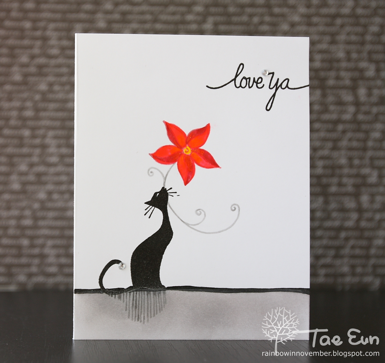 The flower is from Doodle Blooms stamp set by Altenew which I colored also using glaze pens. I drew the stem and the shadow of the cat by hand in grey.
