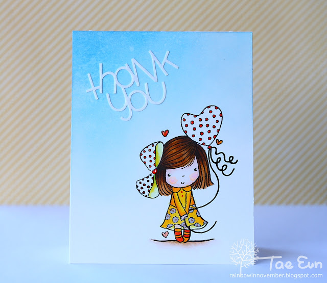 I stamped the image on a watercolor paper using StazOn black ink. I then colored it with Zig Brush pens. The red dots were drawn with Sakura glaze pen. After I masked the image, I blended Salty Ocean and Tumbled Glass Distress inks on the upper part of the paper. I sprayed pearl-water Mix on the blended area. The sentiment cut using my Cricut is from the Cricut online store. I wanted the sentiment to look like a cloud, so I left it white and added only Shimmer Pico Embellisher on it.  Also the little hearts were coated with it.
