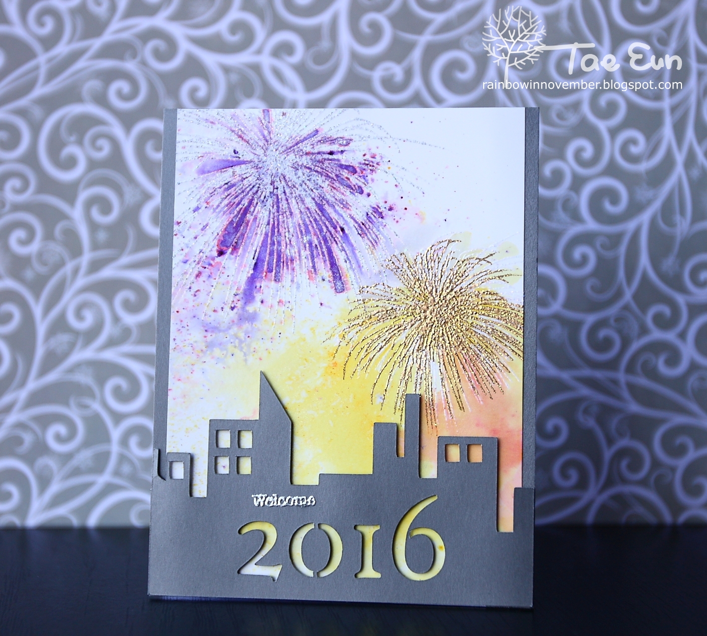 I used Brushos on glossy cardstock for the background as Kylie did. But I had heat embossed the firework from The Ton with Diamond sparkle EP and Gold tinsel EP before I applied Brusho colors. I scattered some powder directly onto CS and sprayed water on it.