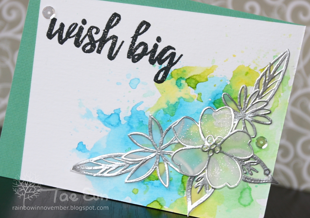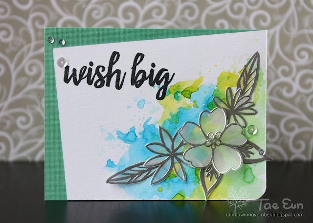 The watercolor paper panel was mounted slightly rotated on a green card base. The sentiment from My favorite things was stamped using black Memento ink. I glued the flowers and leaves flat in their position, only the big flower was adhered using clear foam. Lastly I added some sparkle using Wink of Stella and clear sequins.