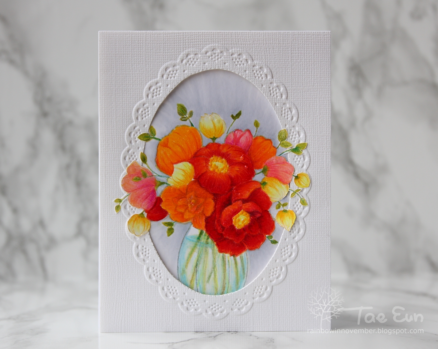 The last card for today is another version of one of my previous cards. This time in red, yellow and orange and in a crystal vase :). I added grey shadow using Copic markers. I cut the oval frame out from a dry embossed panel and cut the part of the flowers which will be outside of the frame, so that they can peek out.