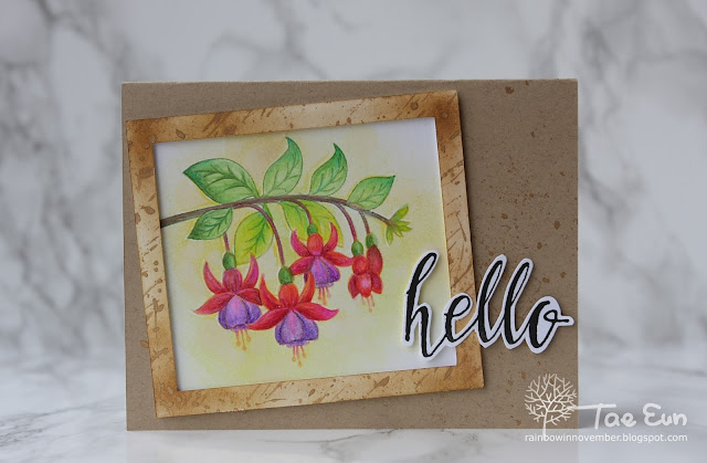 I then made a rectangle frame, blended in light brown and splattered some gold ink, before I mounted it using foam tape. I added some gold splatters on the kraft card base too. The sentiment is from Altenew.