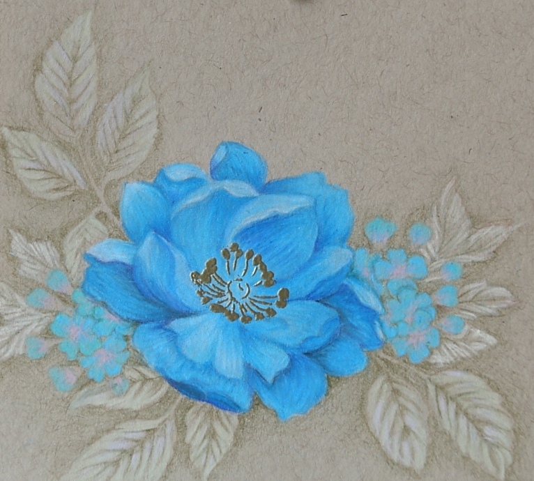 To start off I stamped the big flower outline image on my kraft card base using Memento Summer sky and colored it with Prismacolor colored pencils. I then stamped the stamen only using embossing ink and heat embossed it in gold. The little flower clusters and the branchs were stamped in sand after I masked the already colored flower. I colored the little flowers in light blue with pink center. And then I added shadows in the background with a gold pencil. The leaves got some highlights in light beige. I am very happy with how it turned out.