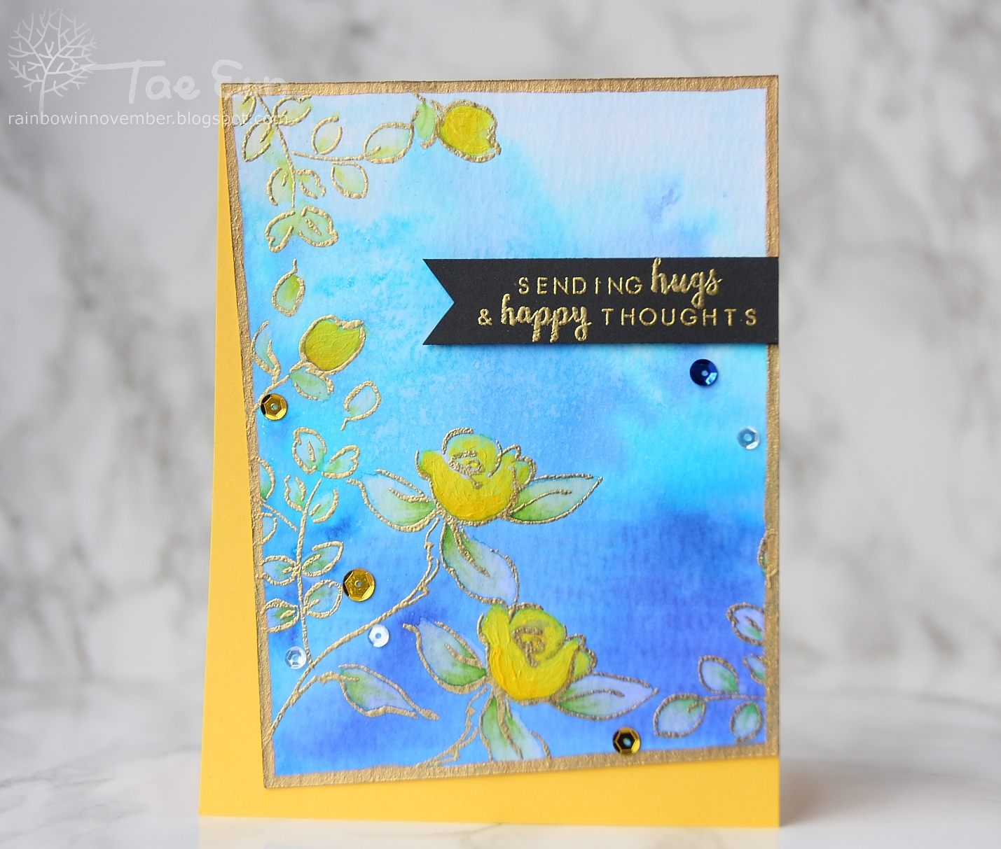The sentiment in gold on a black banner is from Beautiful day stamp set by Altenew.