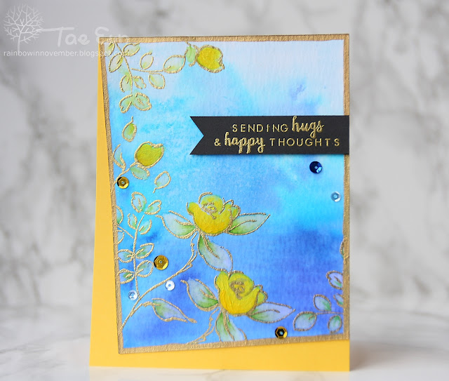 To start off I colored the background with Tombow dual brush markers on a watercolor CS, sprayed plenty of water on it and let it dry. I then stamped the images from Golden Garden stamp set by Altenew using embossing ink and heat embossed them in gold.