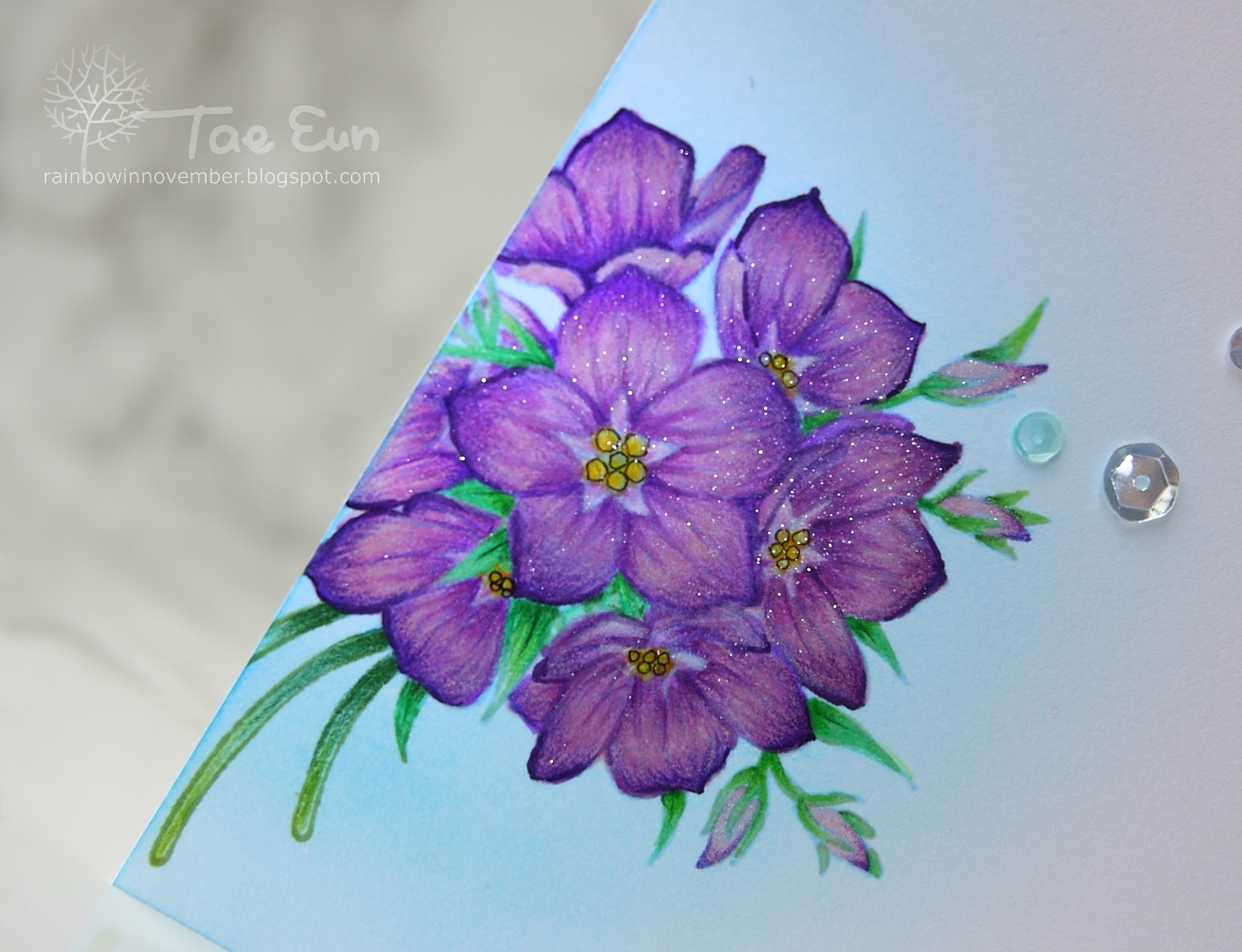 To start off I stamped the same sentiment as on the first card in purple. I then placed a butterfly above the sentiment. This beautiful butterfly is from a mini stamp set by Technique Tuesday. I stamped it in purple, colored using Prismacolor pencils, stamped again with embossing ink and clear heat embossed it.
