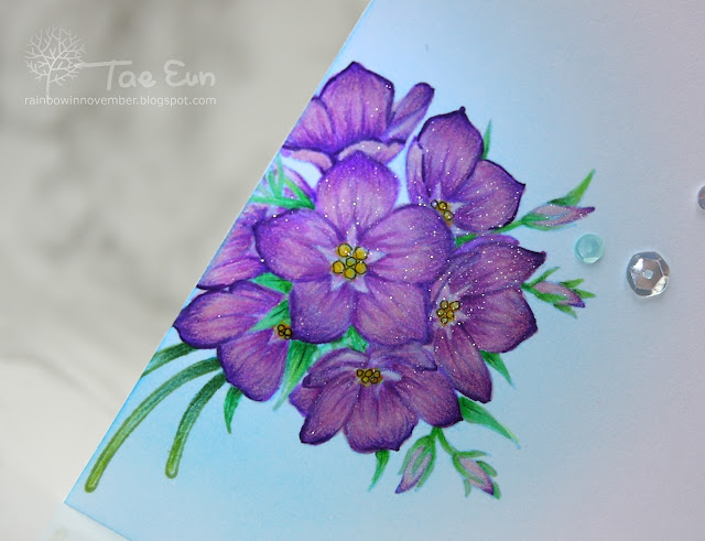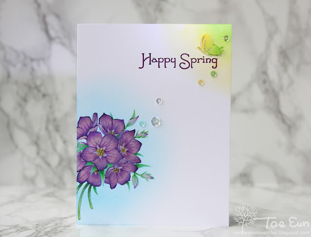 The flower bouquet is from Sweet Posies stamp by JustRite. Before I stamped the image slightly offset I blended Salty Ocean DI on the card base where I wanted to place the bouquet. The image was stamped in blue and colored using Copic markers and Prismacolor colored pencils. I added on the stamen some little dots using Pico Embellisher and coated the flowers with clear Wink of Stella. The sentiment from Penny Black was stamped with Grape Juice Ink. I then blended the right upper corner in green and yellow using Distress inks. The butterfly was punched out from a scrap CS which I sponged in green and yellow. For final touch I added some clear sequins along with some in spring colors.