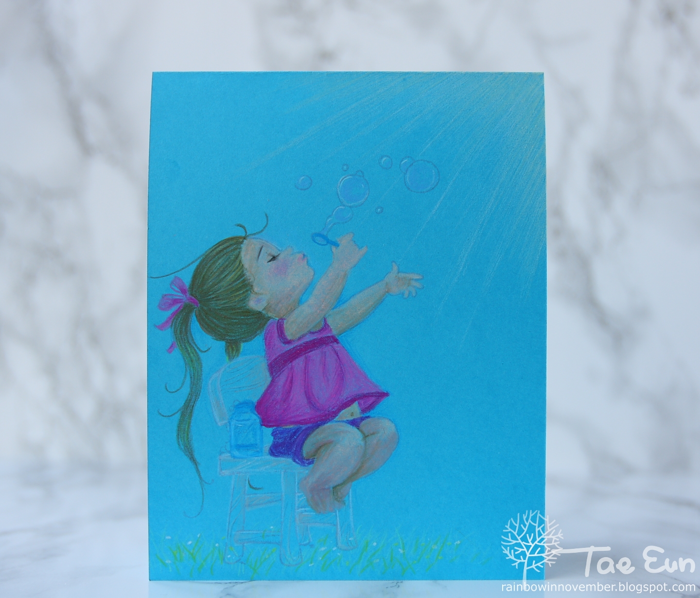 This image is Bubble Girl stamp from Penny Black. I stamped it in light blue on a light blue CS, colored with Prismacolor pencils.