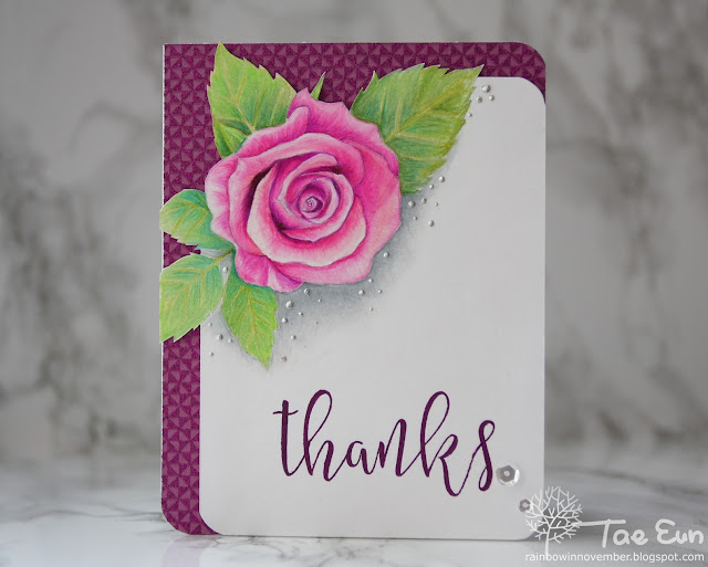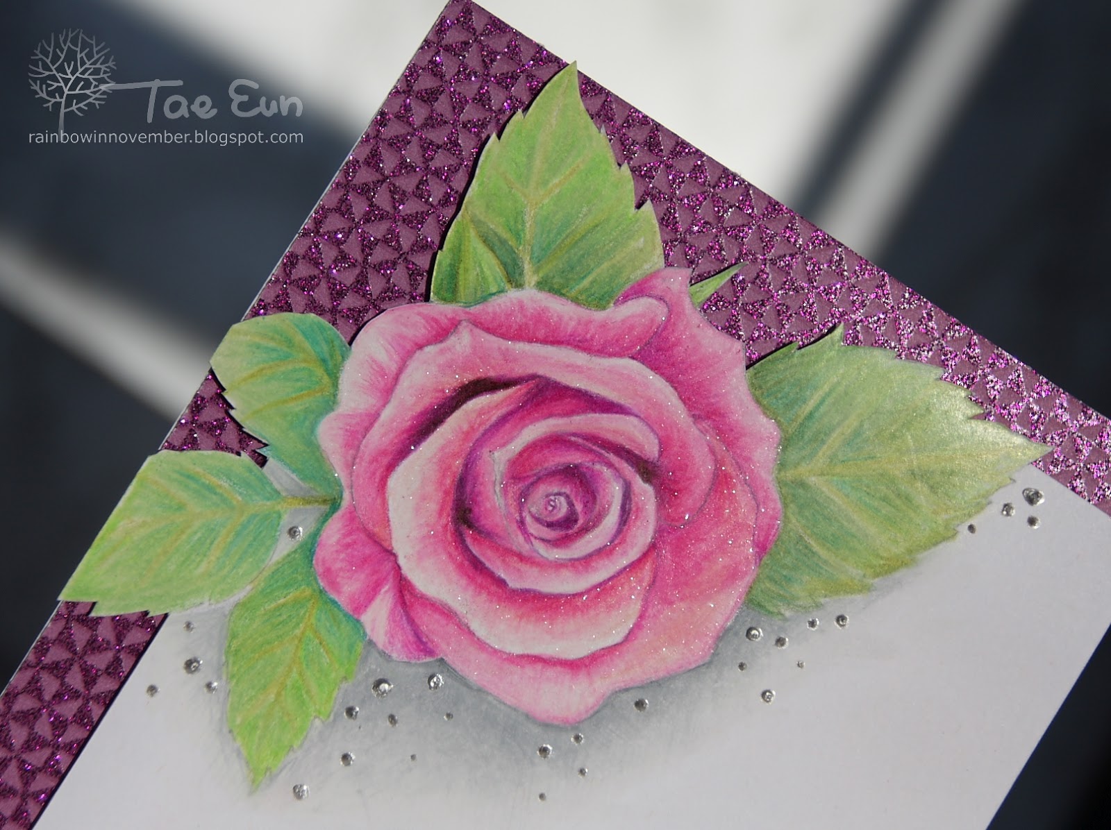 This card features my drawing of a pink rose, colored using Prismacolor pencils. I cut the panel into a smaller rectangle than a A2 card base and along the outline of the flower image, rounded the corners and mounted it on the A2 card base using some foam tape, one side of which I covered with a glitter pattern paper. The sentiment was stamped using the Sophiscated Script stamp set from Concord & 9th in purple. I covered the rose and the sentiment with the clear Wink of Stella. To finish off I added some dots using silver Liquid pearls and clear sequins.