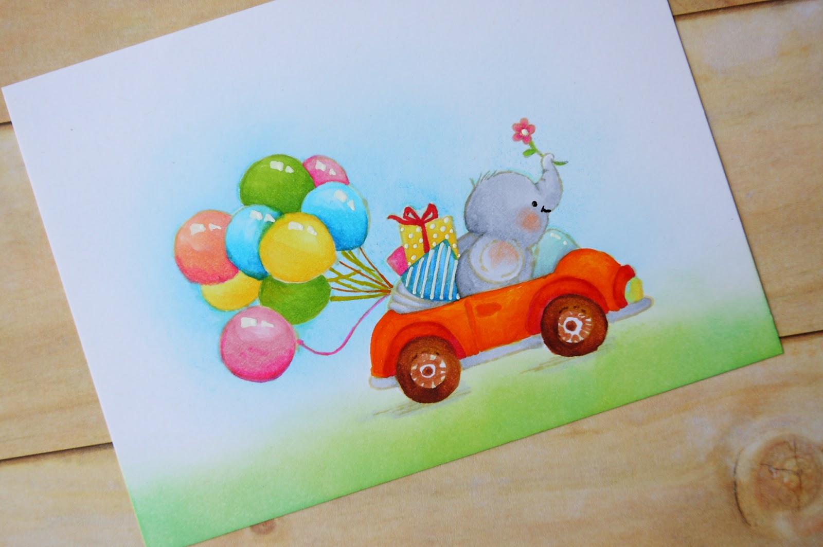 This cute elephant is Bella from Wildrose Studio, colored with Copic markers. I blended some DIs after masking for the background.