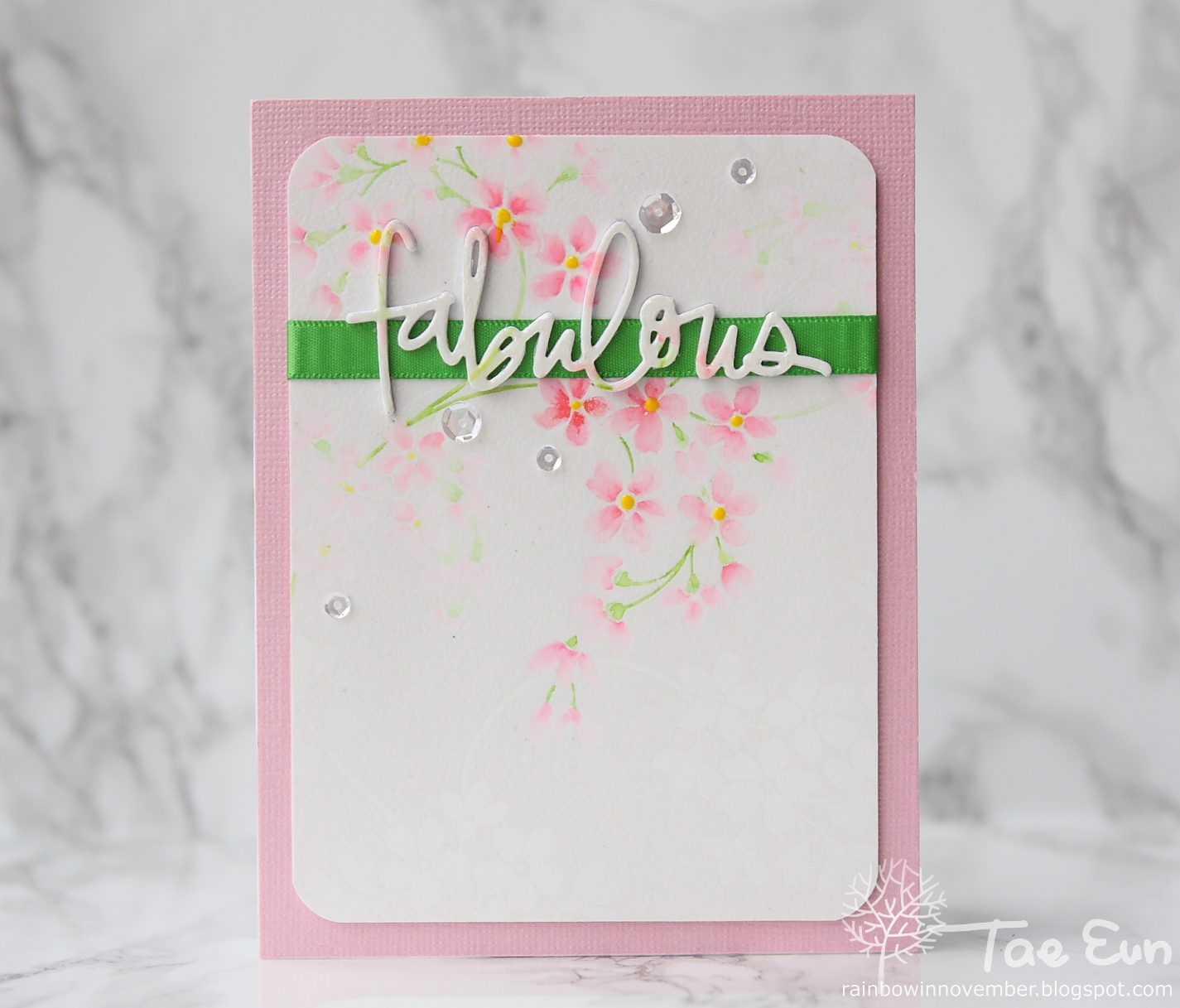 I started off by stamping the Glory of modesty, a background stamp from Penny Black, using embossing ink and clear heat embossing it. I then colored the upper part of the flowers using Zig brush pens and added yellow dots in the center of the flowers with Pico embellisher. The sentiment was cut four times, one from the colored panel and three from white CS and stacked up.  I added a green ribbon for some interest, so it is actually not a perfect camouflage:). I mounted a textured soft pink Bling CS on the base and adhered the front panel with foam tape.