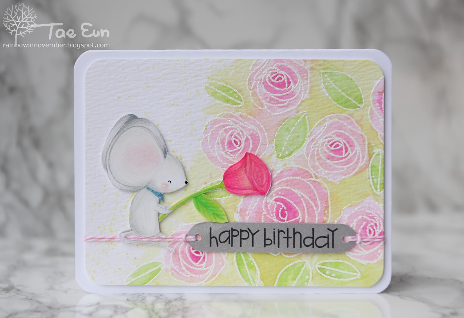 I made the background by white heat embossing the roses and leaves from the Best Mom Ever stamp set by SSS on a water color paper and coloring them using DIs. I tied the sentiment on a grey shimmer CS using pink twine to give Frieda something to stand on. The sentiment is from Paper Smooches.