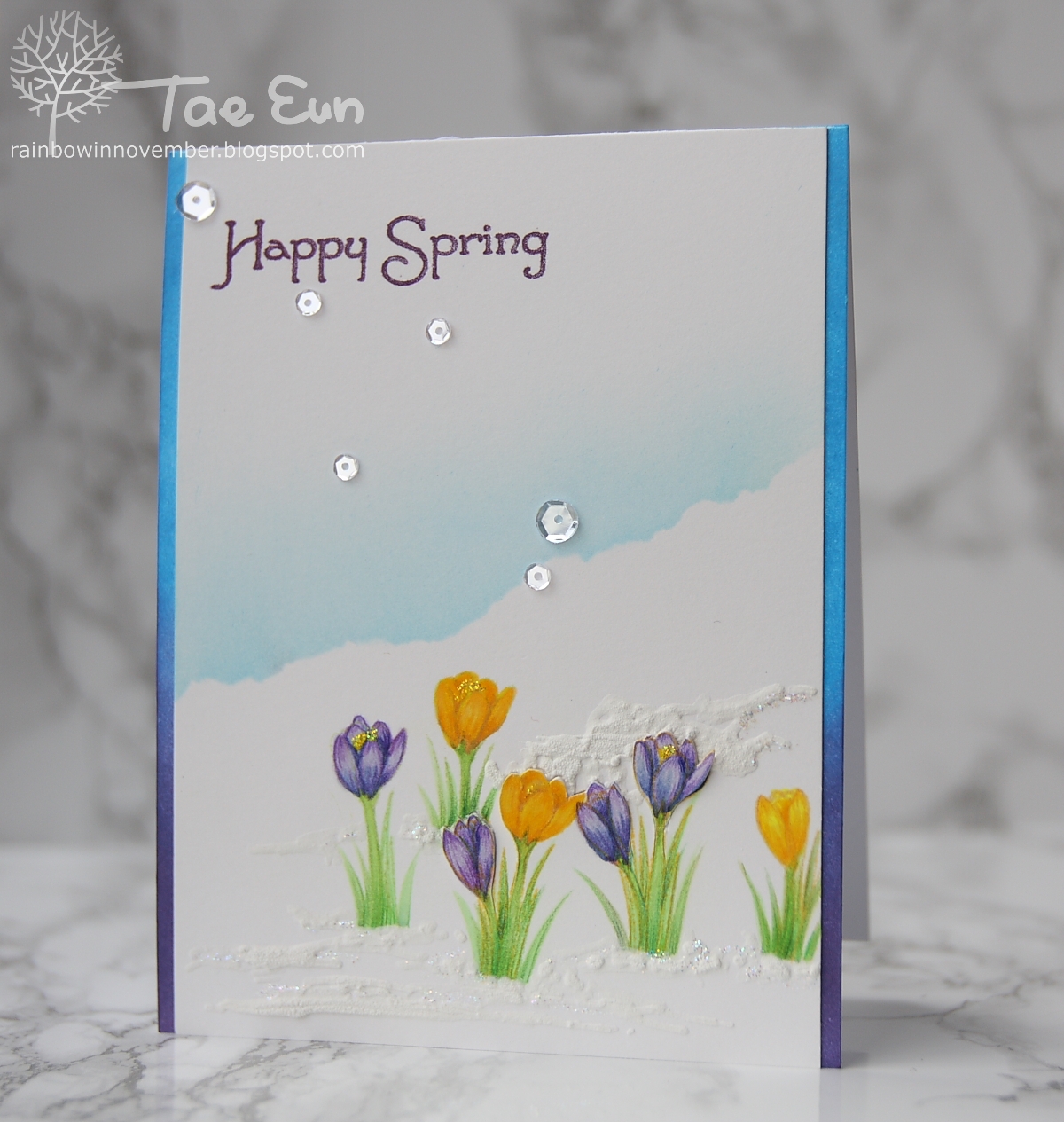 I love crocus, one of the first flowers after the long winter. As I saw some photos of snow crocus on the internet. I wanted to make the scene into a card.