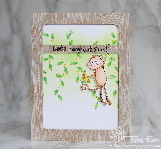 I stamped the monkey with a banana in his hand on a white CS, colored him using Copic markers and fussy cut him. I then made a cutting file for the frame and cut it from a brown CS. The frame was too dark for my idea so I sponged some white pigment ink on it and stamped woodgrain from Hero Arts in white.