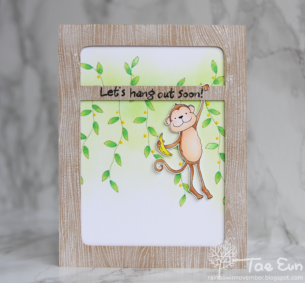 I stamped the monkey with a banana in his hand on a white CS, colored him using Copic markers and fussy cut him. I then made a cutting file for the frame and cut it from a brown CS. The frame was too dark for my idea so I sponged some white pigment ink on it and stamped woodgrain from Hero Arts in white.