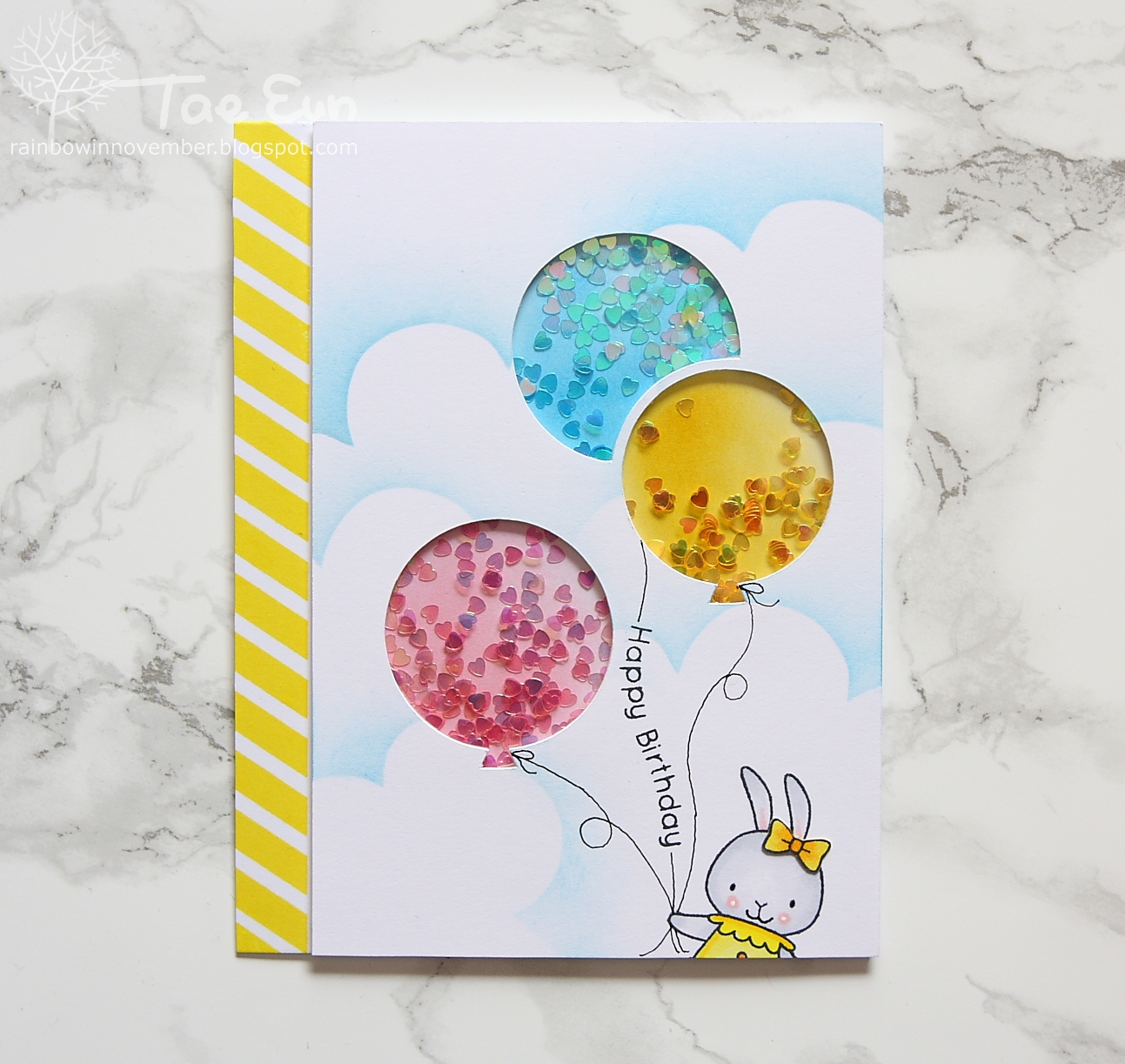 I turned the three circles of the sketch into balloons and made a mini birthday shaker card with them.