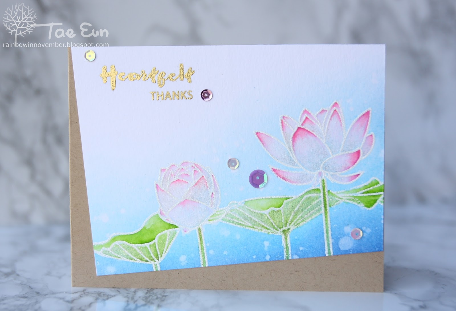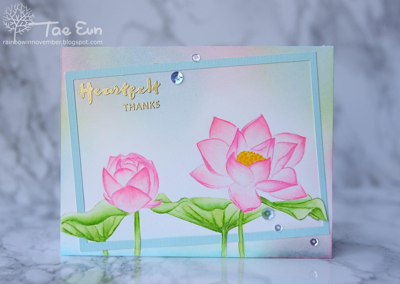 The lotus on the first card was colored with Copic markers. I added shadows in grey (Copic) and blended DIs for the background. The gold heat embossed sentiment is from the same stamp set. The frame is a negative die cut which was in my stash.