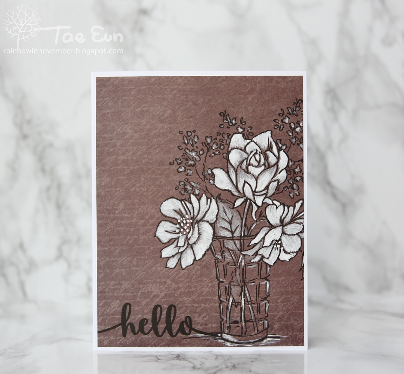 The bouquet in a vase is from Stampendous. I stamped it on a pattern paper using black pigment ink and colored it with white watercolor mixed with only a little water. I couldn’t achieve the detailed look SoonJu made, but I like the result.