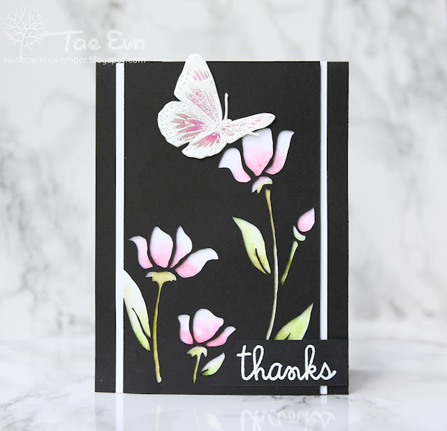 The flowers on my card were drawn on computer and cut with my Cricut from a black CS. I used the negative panel. After I watercolored a piece of Mixed Media paper in pink and green, I mounted it flat on a black card base. I then mounted the flower panel which I cut in size using some foam tape. The butterfly from Stampendous was white heat embossed on a vellum. I added some pink touch on the back of it.