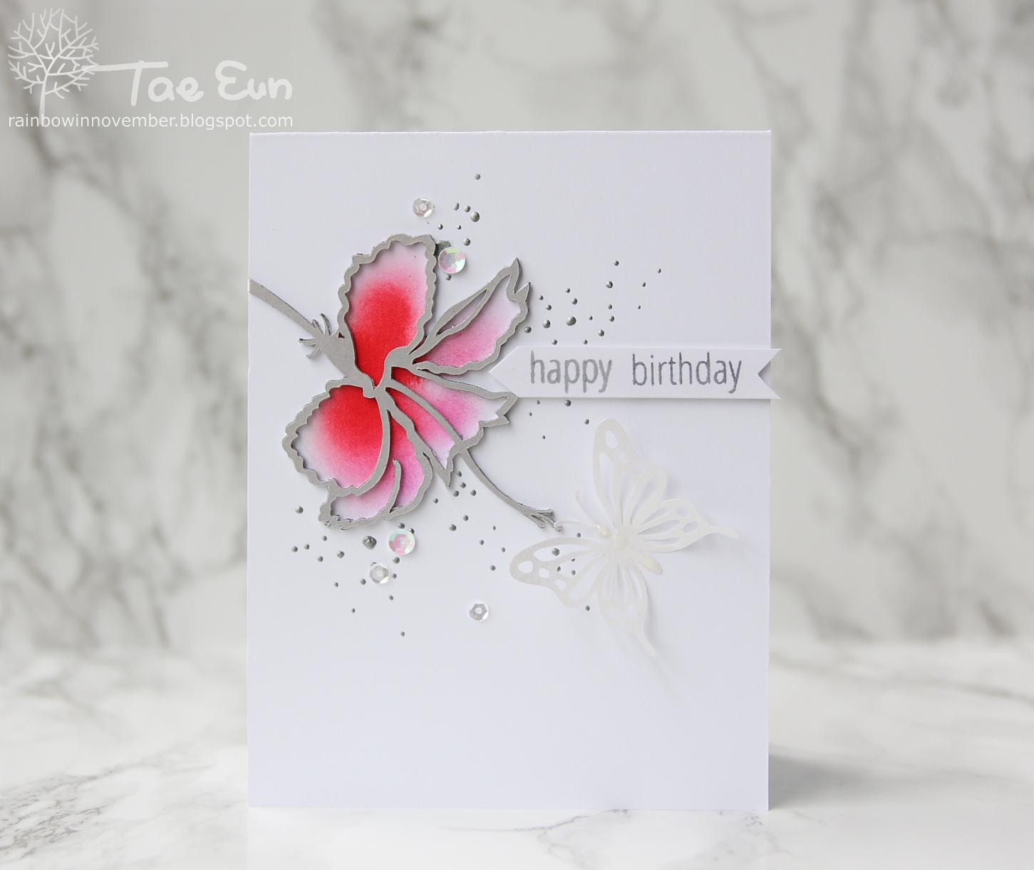 I started off by making a cutting file using my hibiscus sketch which I shared on a previous post. I cut the flower three times from a white CS and once from grey CS with my Cricut. I used the negative piece as a mask and blended red and pink Distress inks on the flower. I then stacked the flower cuts up onto the place. The splatters are dots made using silver Pico Embellisher. I added a vellum butterfly which I drew on computer and cut with Cricut. To finish off I scattered some sequins and applied Glossy Accents on the body of the butterfly.