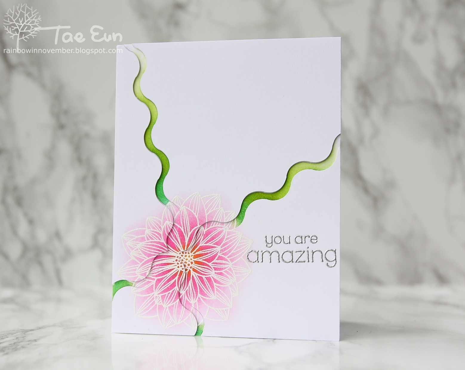 I blended some green DIs on the negative cut-out, adhered it flat on the card base and mounted four front panel pieces using foam tape. The silver heat embossed sentiment is also from Hero Arts.