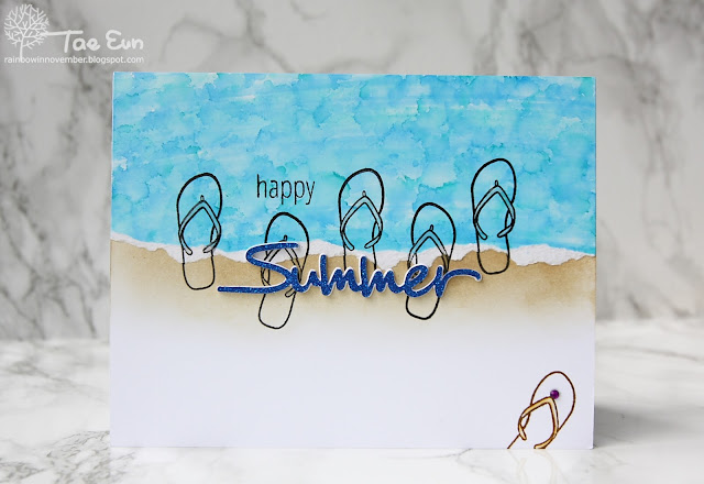 The flip-flop stamp is from Simon Says Stamp. I stamped them using StazOn black on the glossy paper and using black pigment ink on the card base.