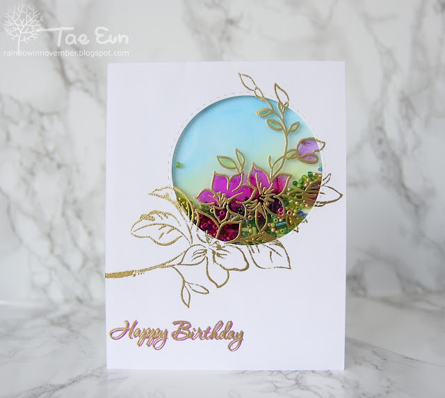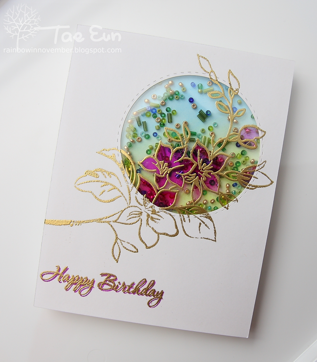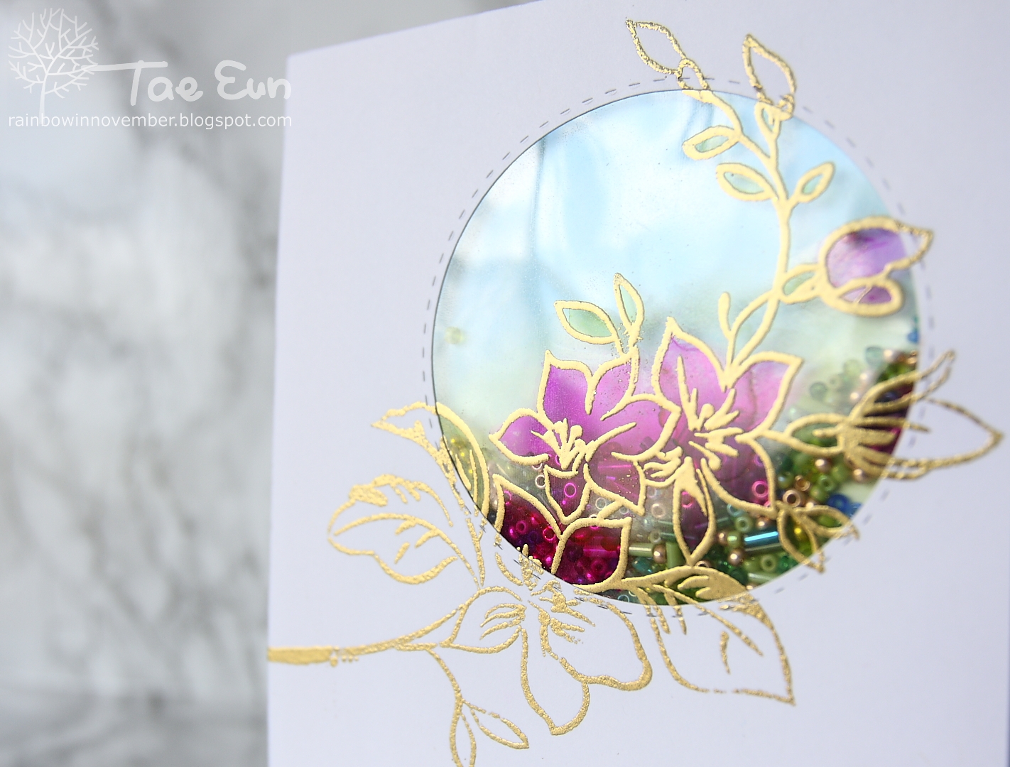 My actual plan was to color on the front of the acetate. But I thought the image from Altenew I chose for today’s card is to small for that technique. So I colored on the back of the acetate after I heat embossed the image in gold. I used my favorite color combo of alcohol inks (Wild Plum, Raspberry) for the flowers and Citrus for the leaves. At first I used the alcohol ink blending pen filled with blending solution. I took some ink with the tip of the pen and colored the image with that. But it left too many strokes of the pen behind. So I decided to drip the ink on the acetate and erase the ink went outside the lines using blending pen, which made the color more vibrant.