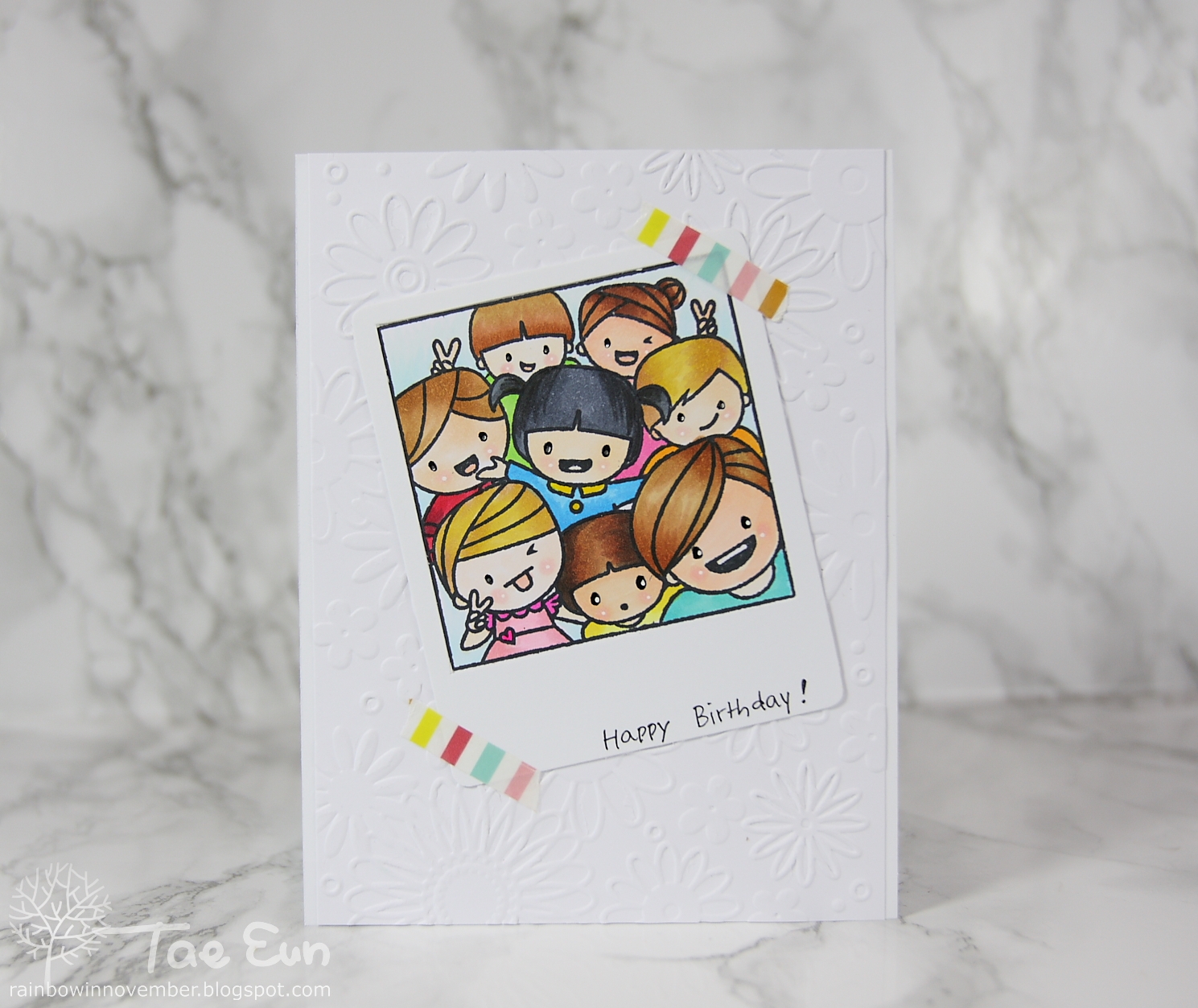 The image was colored with Copic markers. I wrote the sentiment by hand for a real look :)! I added a dry embossed panel as the wall and some washi tape to attach the polaroid pic.