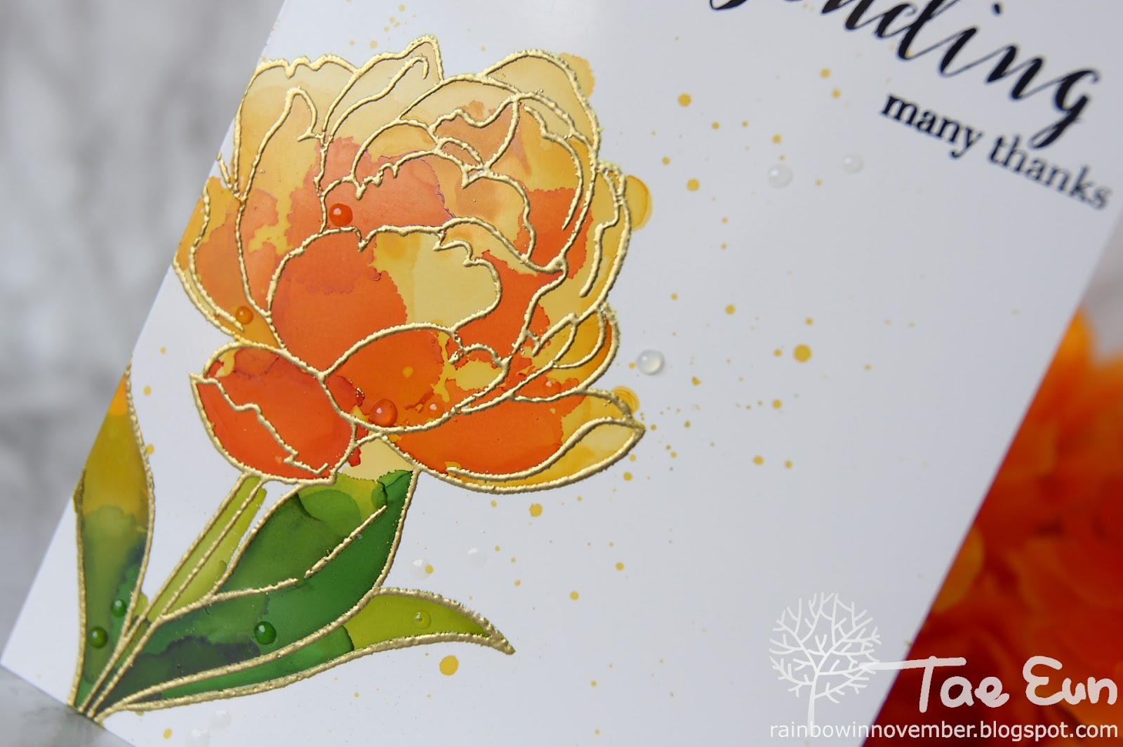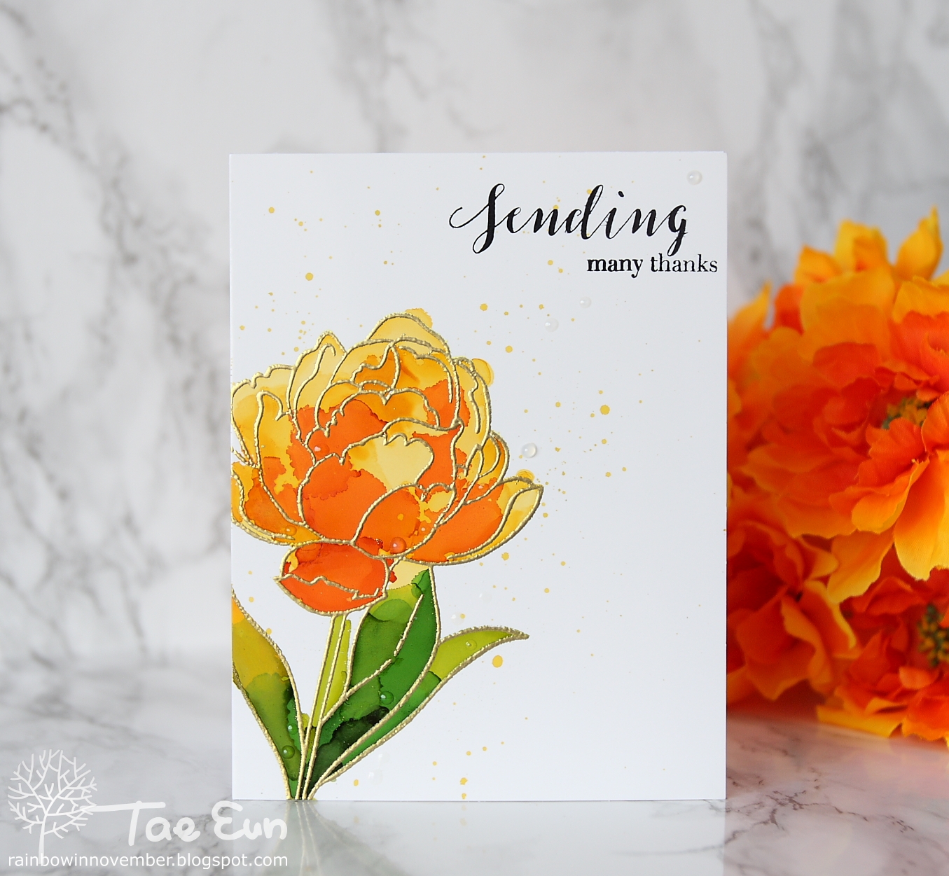 Tulip is one of my favorite flowers. And this gorgeous stamp from The Ton, designed by so very talented EunJi Jung is what I chose for today’s card. As this is a big floral stamp I took out my alcohol inks and a glossy CS. After I gold heat embossed the image, I dripped the alcohol ink (Lemonade, Sunshine Yellow and Sunset Orange for the flower/ Citrus, Botanical and Pesto for the stem and leaves) carefully on the image and tilted the paper to move the ink to the intended direction. I then gold heat embossed the image again with the help of Misti. The splatters were made with Sunshine Yellow.
