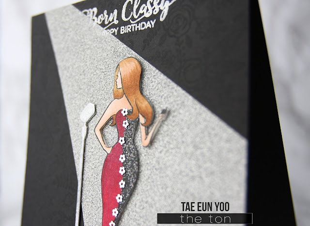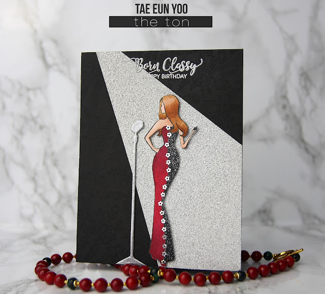 Today The Ton is showcasing 3 clear stamps : Plus One, Born Classy, City Girls (Retail Therapy) and 3 rubber cling background stamps : Folk Art Florals Background, Scenes: Grand Stairway and Scenes: Dept. Store. Coordinating dies and 5 basic word dies in our gorgeous scripty font will be available on Monday Sep. 26, too! (Stop by The Ton blog for more details about our dies ! :))