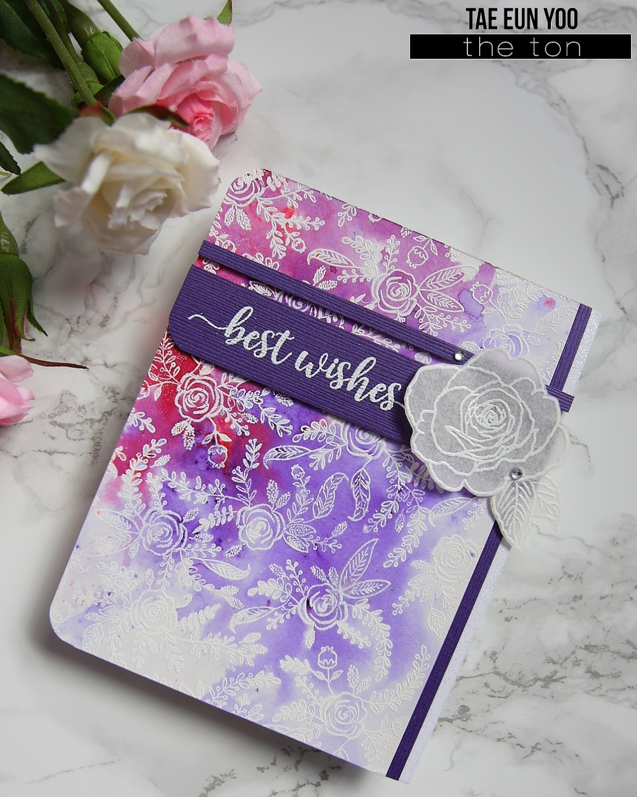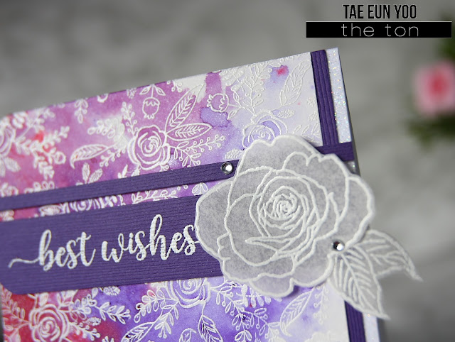 To adorn this card I used the big rose and leaves from the Coordinating Outlines: Fresh Cut Garden Roses stamp set which debuted yesterday. I white heat embossed them on a vellum and fussy cut them to add onto the card. (Coordinating dies will be available! :)) I rounded two left corners and finished off my card by adding two clear rhinestones.