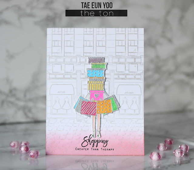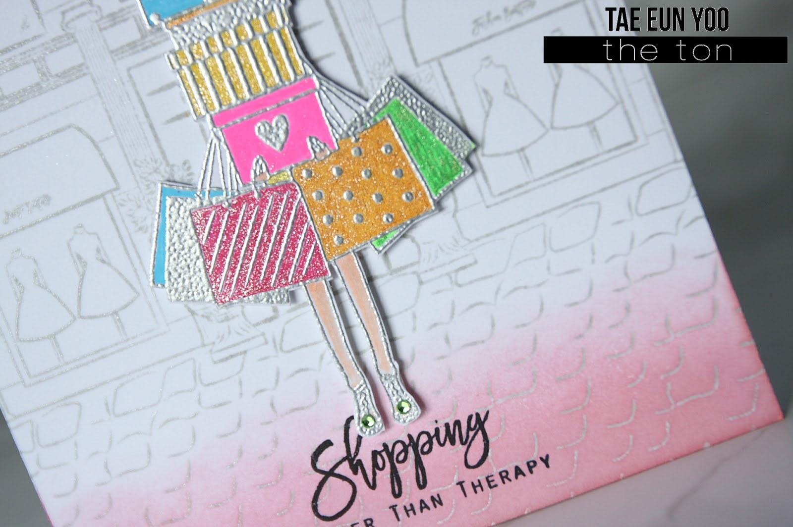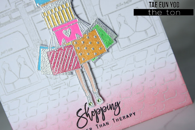 The girl with shopping bags and boxes from City Girls (Retail Therapy) stamp set was silver heat embossed on another piece of white cardstock. I colored the bags and boxes with stardust glitter pens and some glaze pens in bright colors and her legs with Copic markers. I fussy cut the girl (coordinating dies will be available on Sep. 26.) and foam mounted her on the card base. I then added two soft green gems on her shoes for some sparkle.