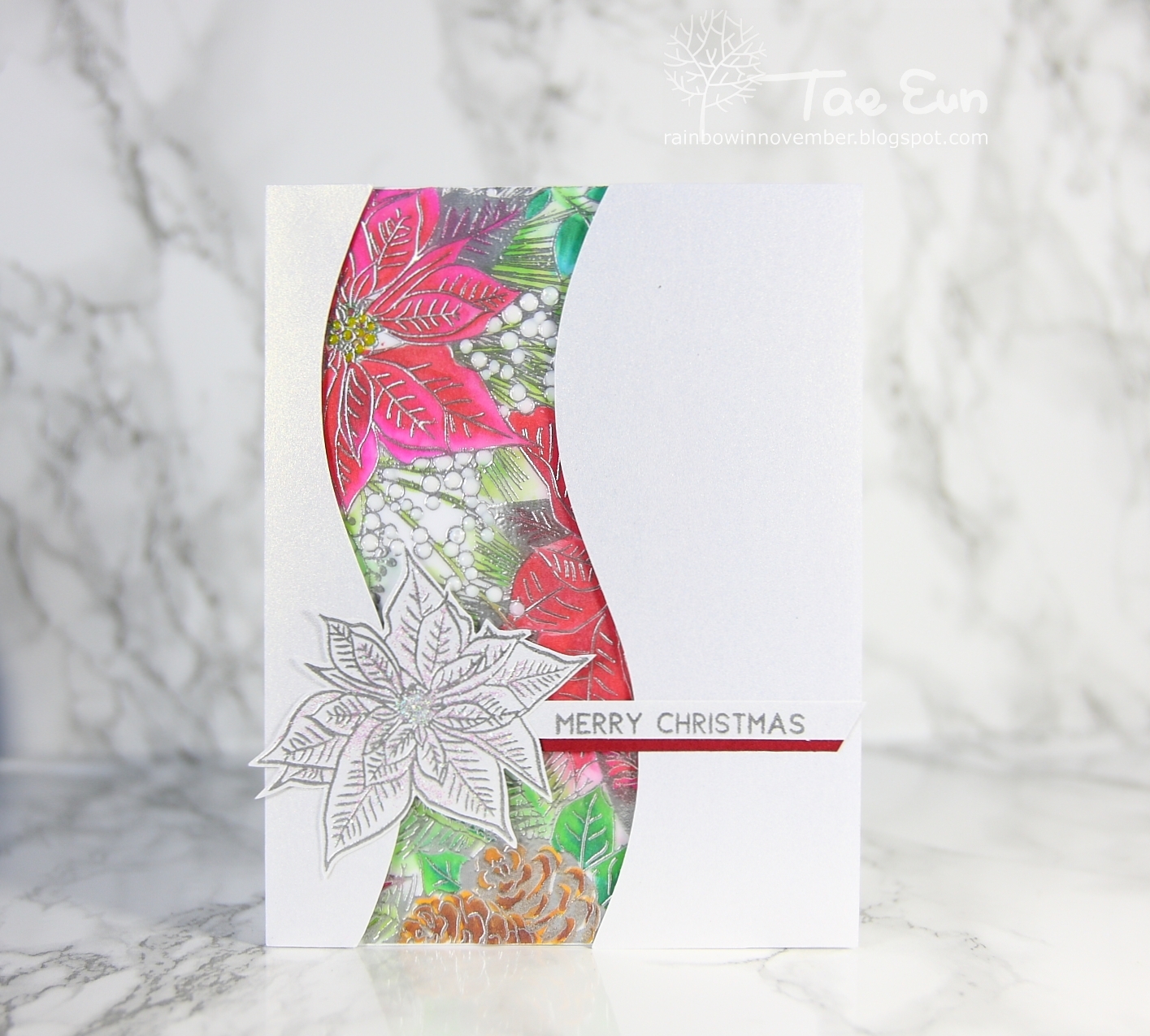 For my first card I stamped the Poinsettia Garden Background on a vellum using embossing ink and heat embossed it in silver. I then colored it on the back using Tombow markers and added Wedding Dress Pico on the Mistletoe berries. The waved panel was cut with my Cricut from a shimmery silver cardstock. After I adhered the vellum panel on my card base, I foam mounted the waved panel. The poinsettia was silver heat embossed on the same silver cardstock and fussy cut. The sentiment is from the Christmas Poinsettia mini stamp which I also silver heat embossed on a thin strip of the silver cardstock. I added Crystal Stickles on the poinsettia and a strip of a dark red cardstock underneath the silver sentiment, and then mounted it altogether on the card.