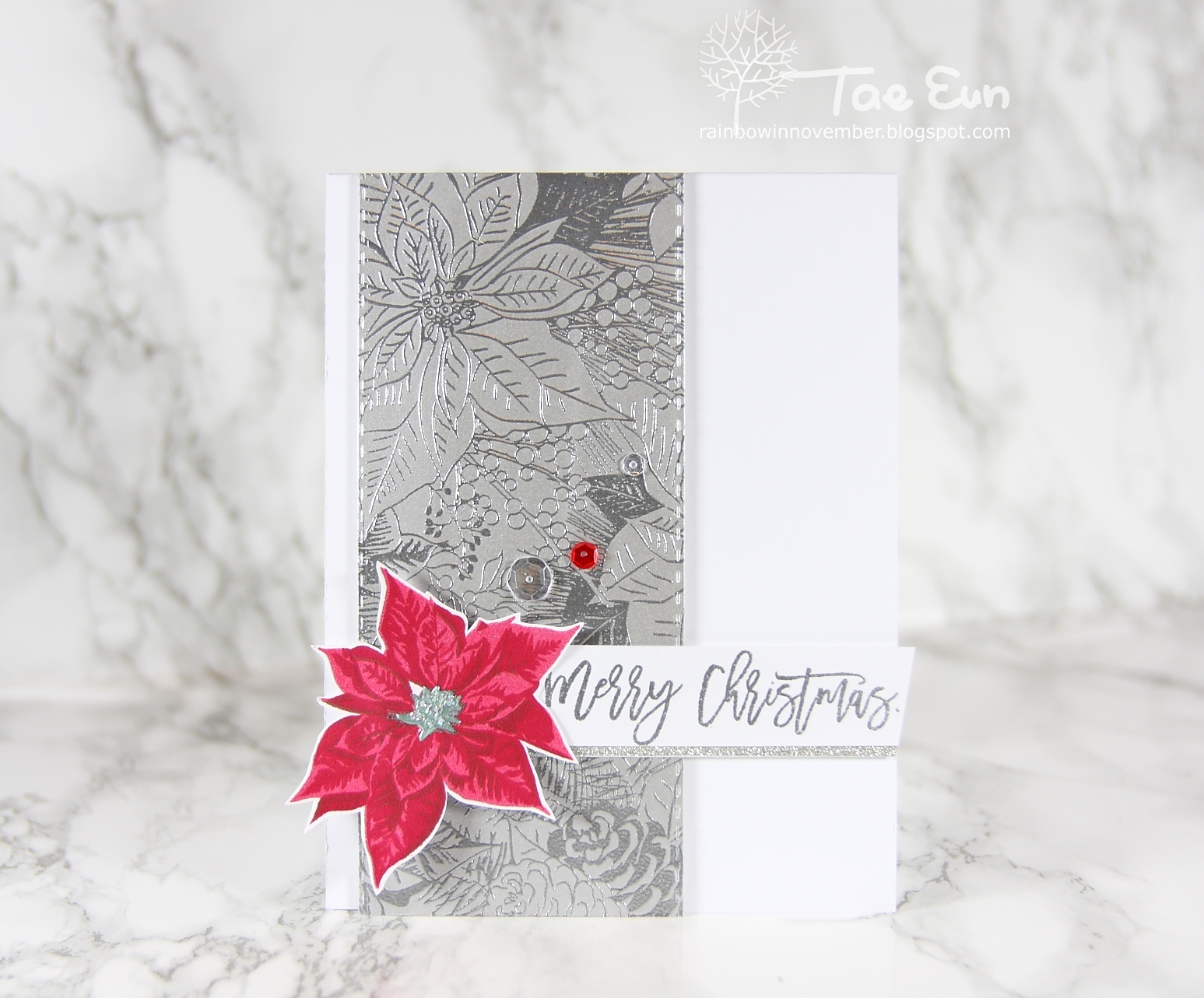 For the layout of both cards I took the awesome sketch of the CTS by Leigh Penner. I used some christmas stamps from the Fall Release of The Ton: Poinsettia Garden Background, Fresh Cut Poinsettias and Fresh Cut Poinsettias Outline stamp.